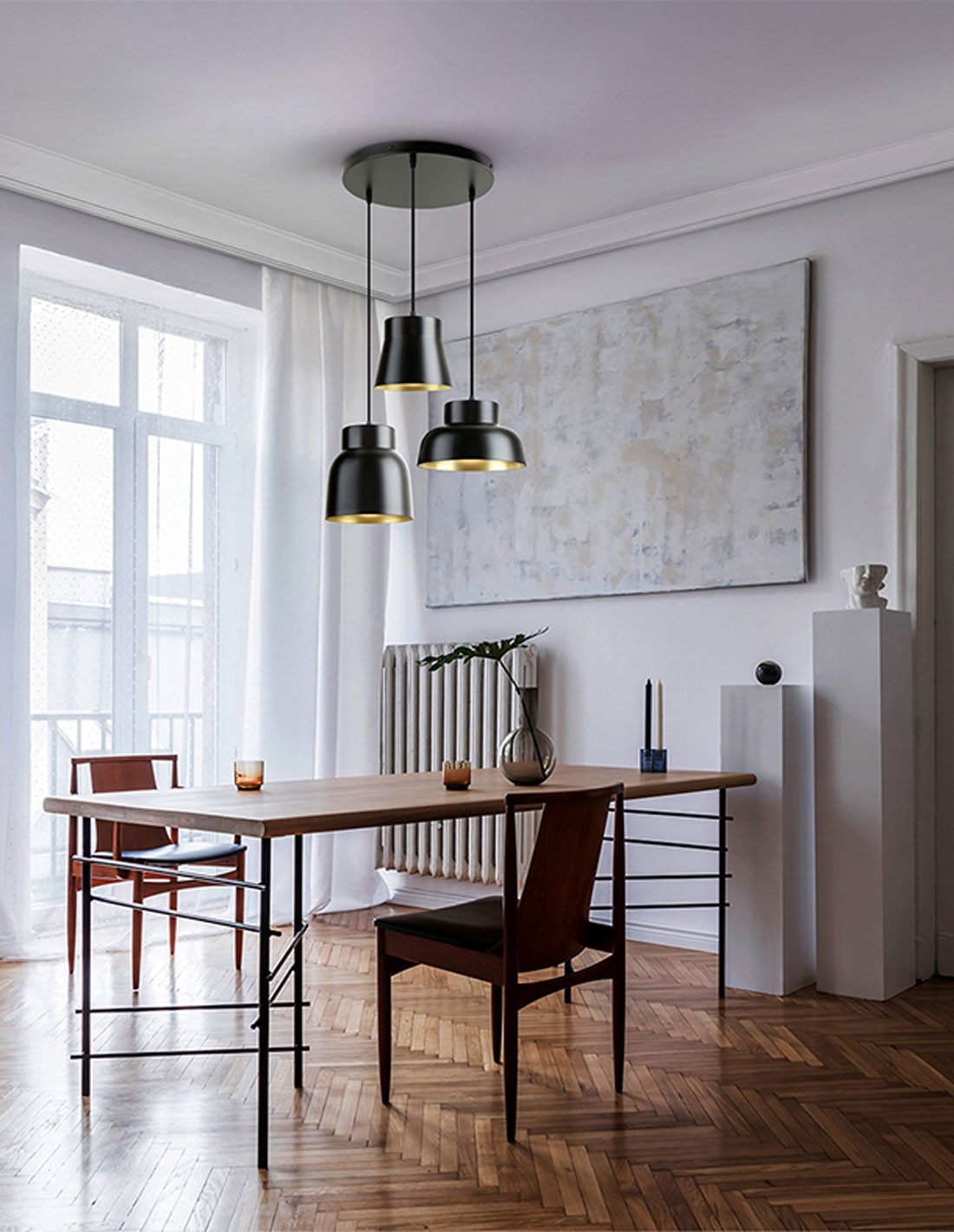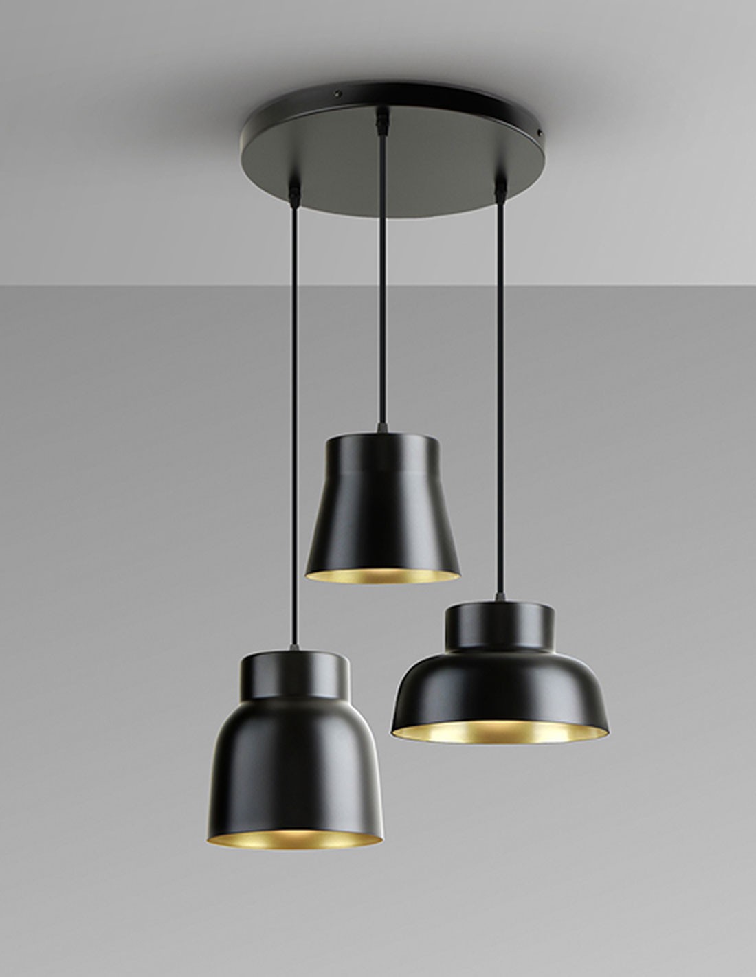 Vulcano, colección de lámparas formada por colgante individual, lámpara lineal de 3 luces, y plafón de techo de 3 luces.