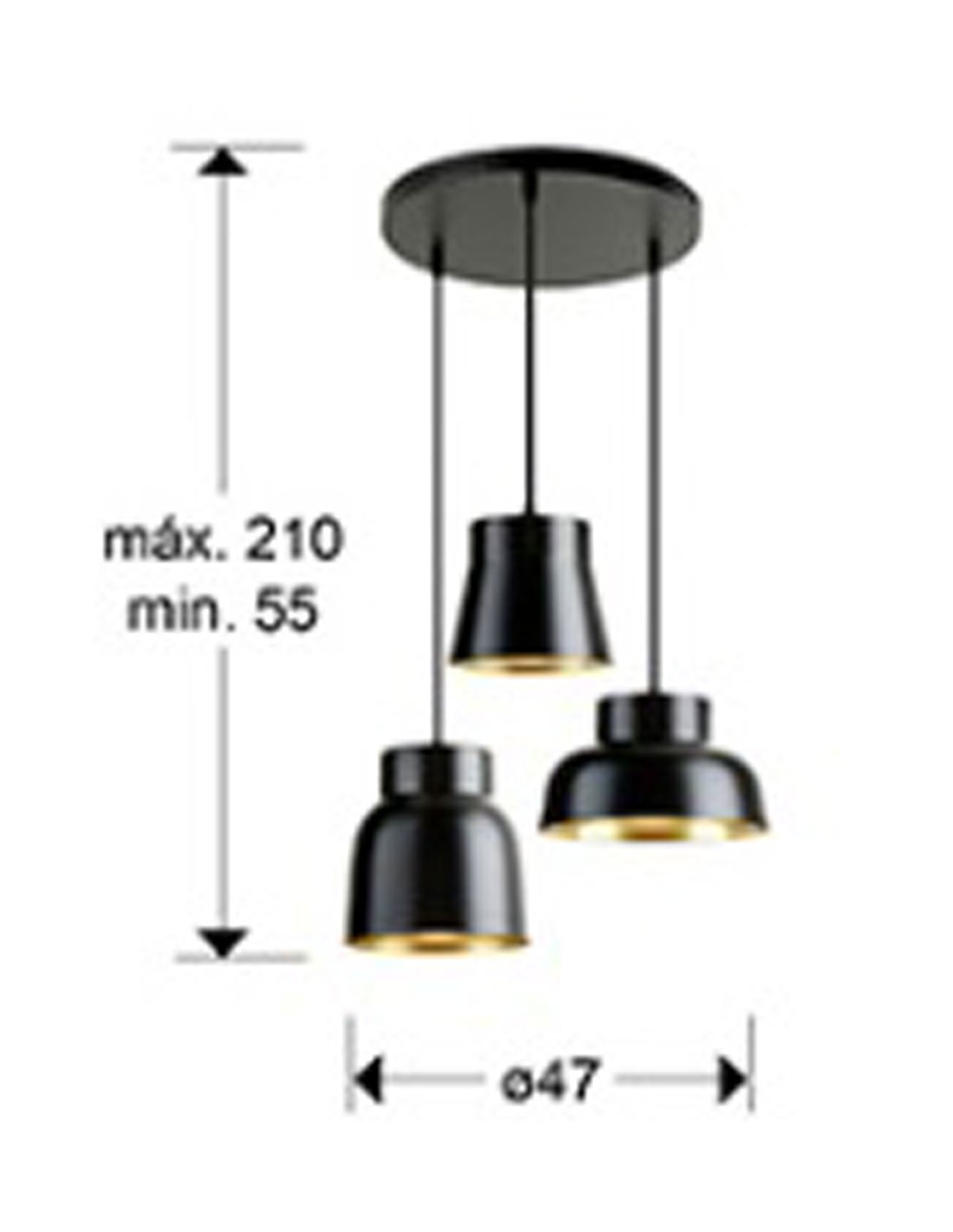 Lámpara de Techo plafón con 3 Luces de metal acabado negro mate con tulipas interior oro. Altura ajustable.
