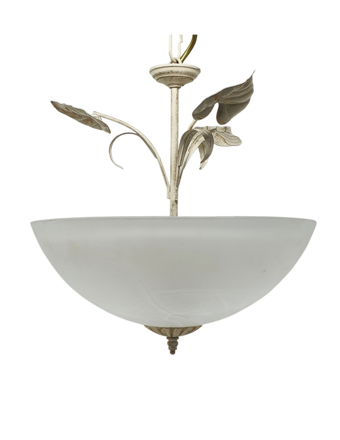 Lámpara de techo de 3 luces, fabricado en forja decorada crema oro y cristal blanco marmolizado. Altura ajustable.