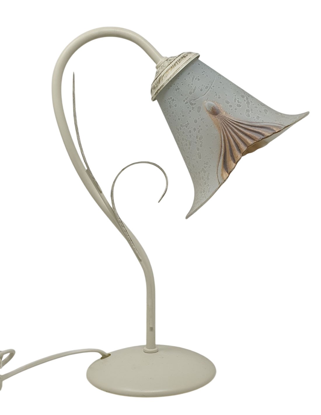 Sobremesa de 1 luz de metal acabado marfil con tulipa de cristal blanco beteado-oro. Alto 34 cm.