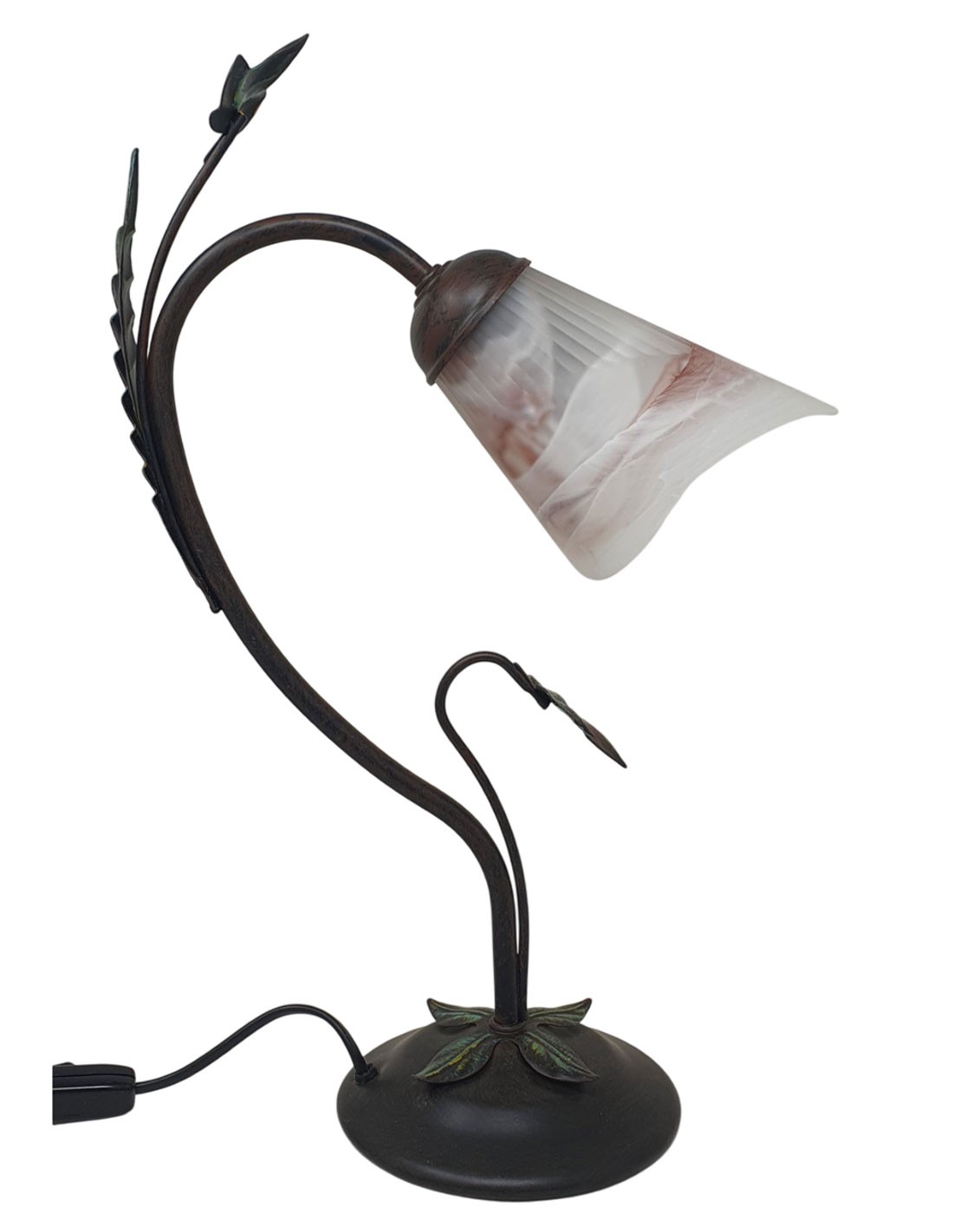 Sobremesa de 1 luz de metal acabado marrón con tulipa de cristal y detalle de hojas. Alto 44 cm.