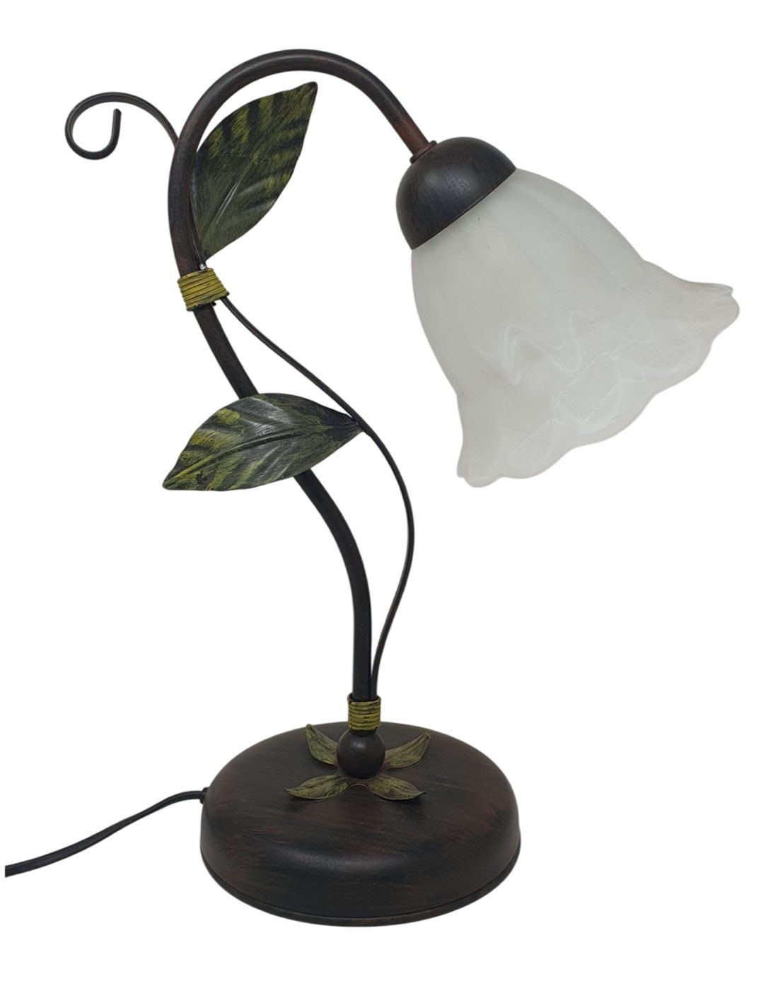Sobremesa de 1 luz de metal acabado marrón con tulipa de cristal y detalle de hojas. Alto 44 cm.