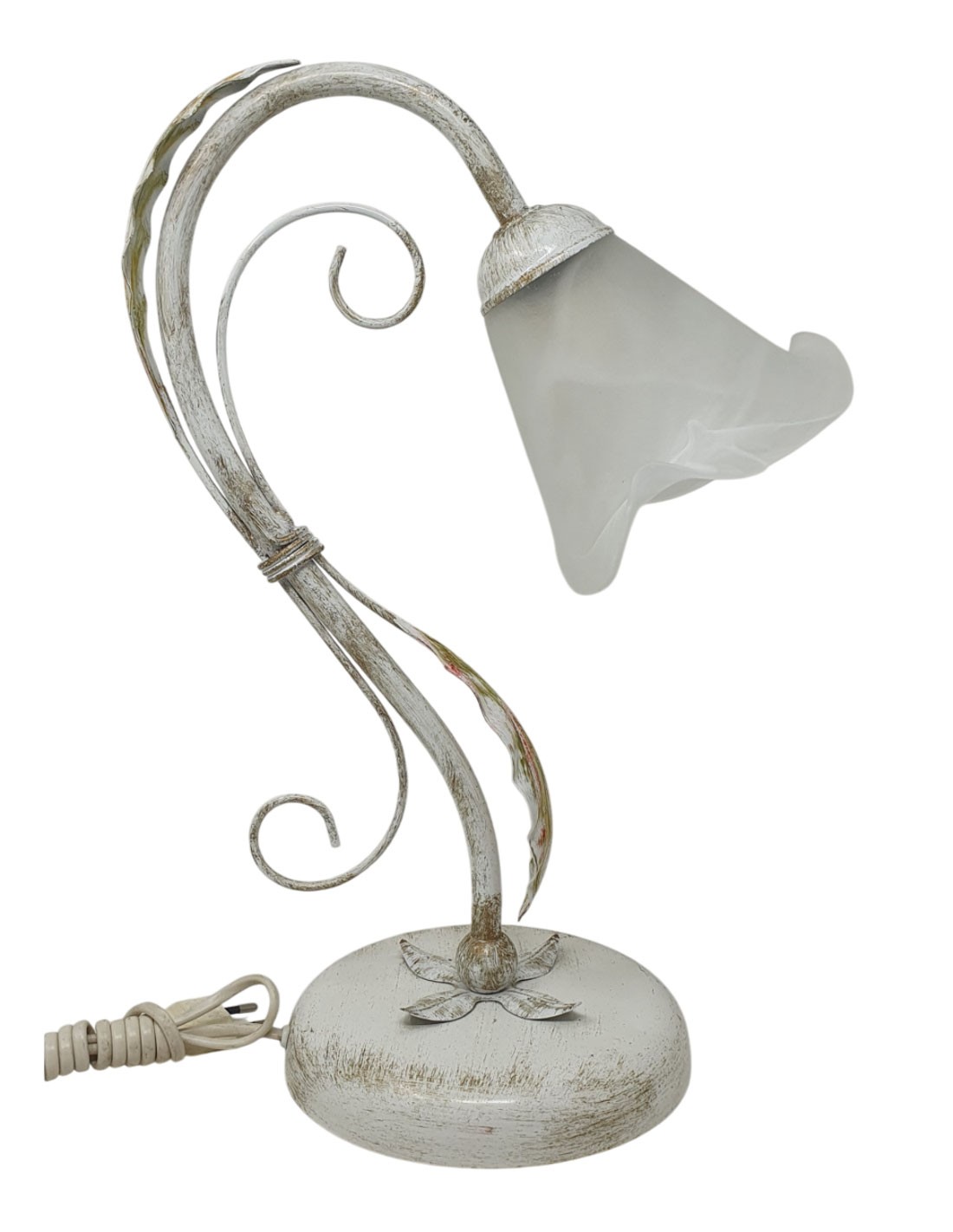 Sobremesa de 1 luz de metal con ramas acabado marfil oro y tulipa de cristal blanco beteado-oro. Alto 34 cm.