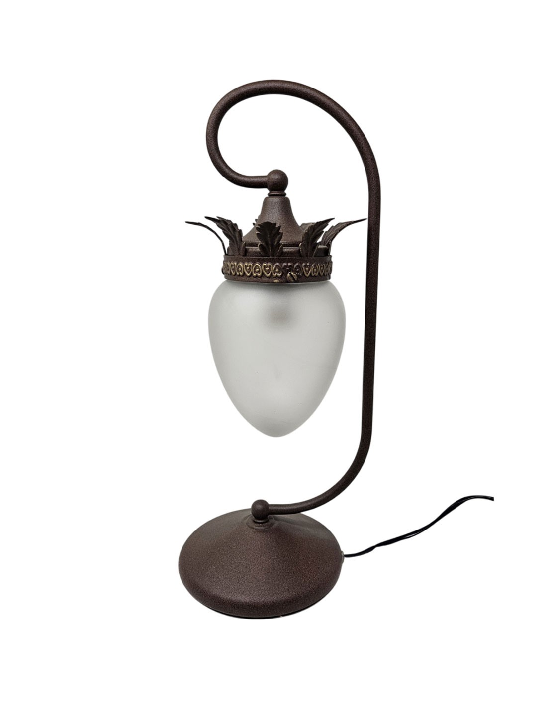Sobremesa de 1 luz de metal acabado marrón óxido con tulipa de cristal. Alto 40 cm.
