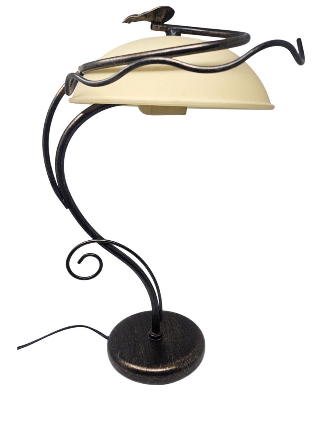 Lámpara de Sobremesa de 1 luz de metal acabado marrón con cristal beige de 25 cm. Detalle hoja de parra en parte superior.