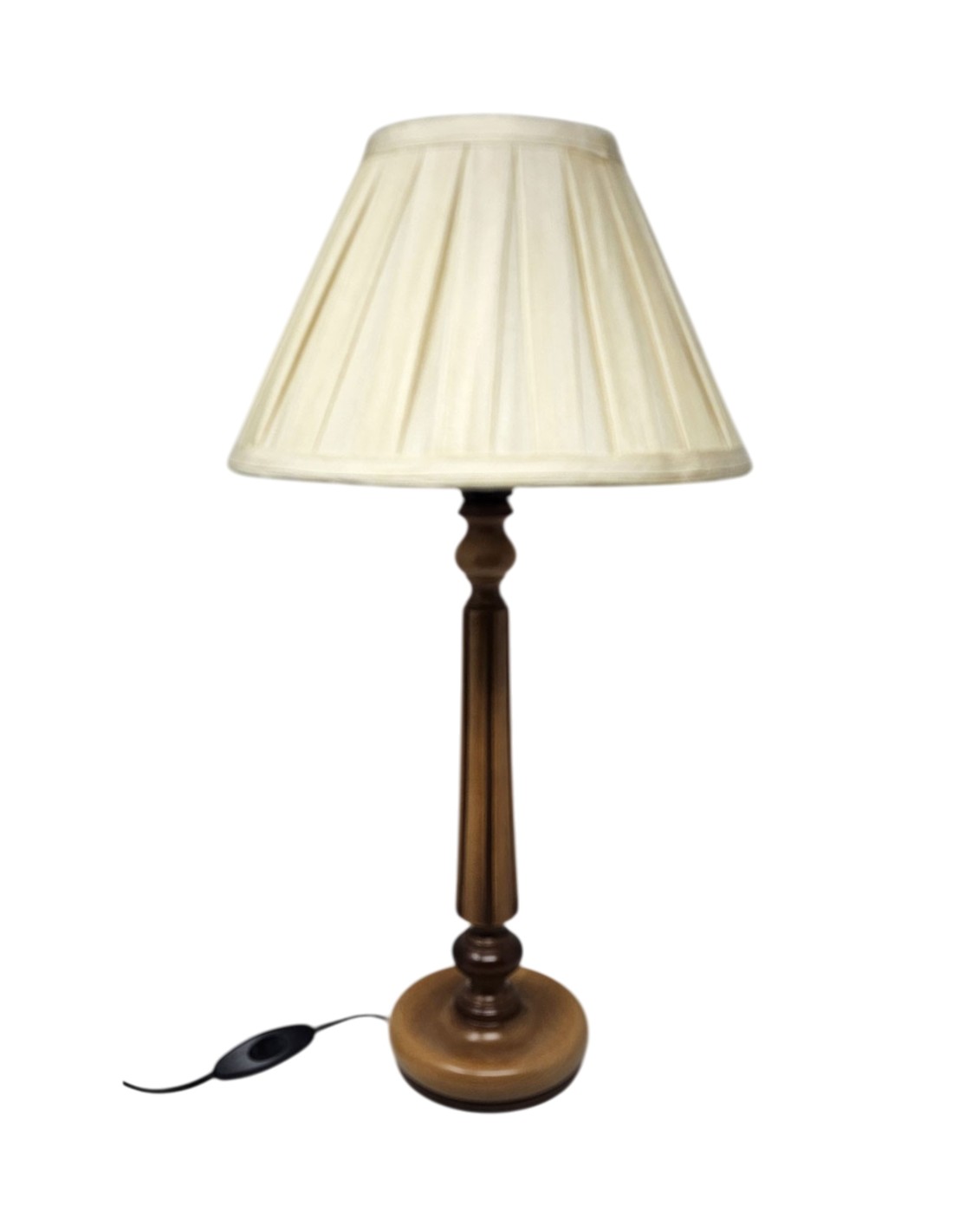 Lámpara de sobremesa de 1 Luz de madera con columna torneada y tubo. Incluye pantalla de tela.