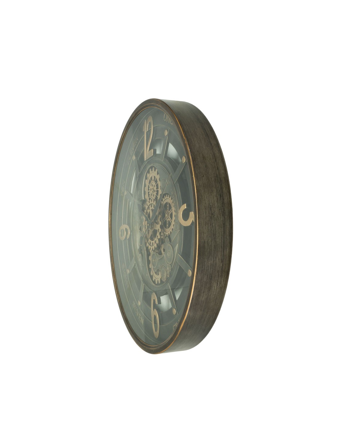 Reloj de pared estilo vintage e industrial realizado en metal y cristal acabado negro oro.