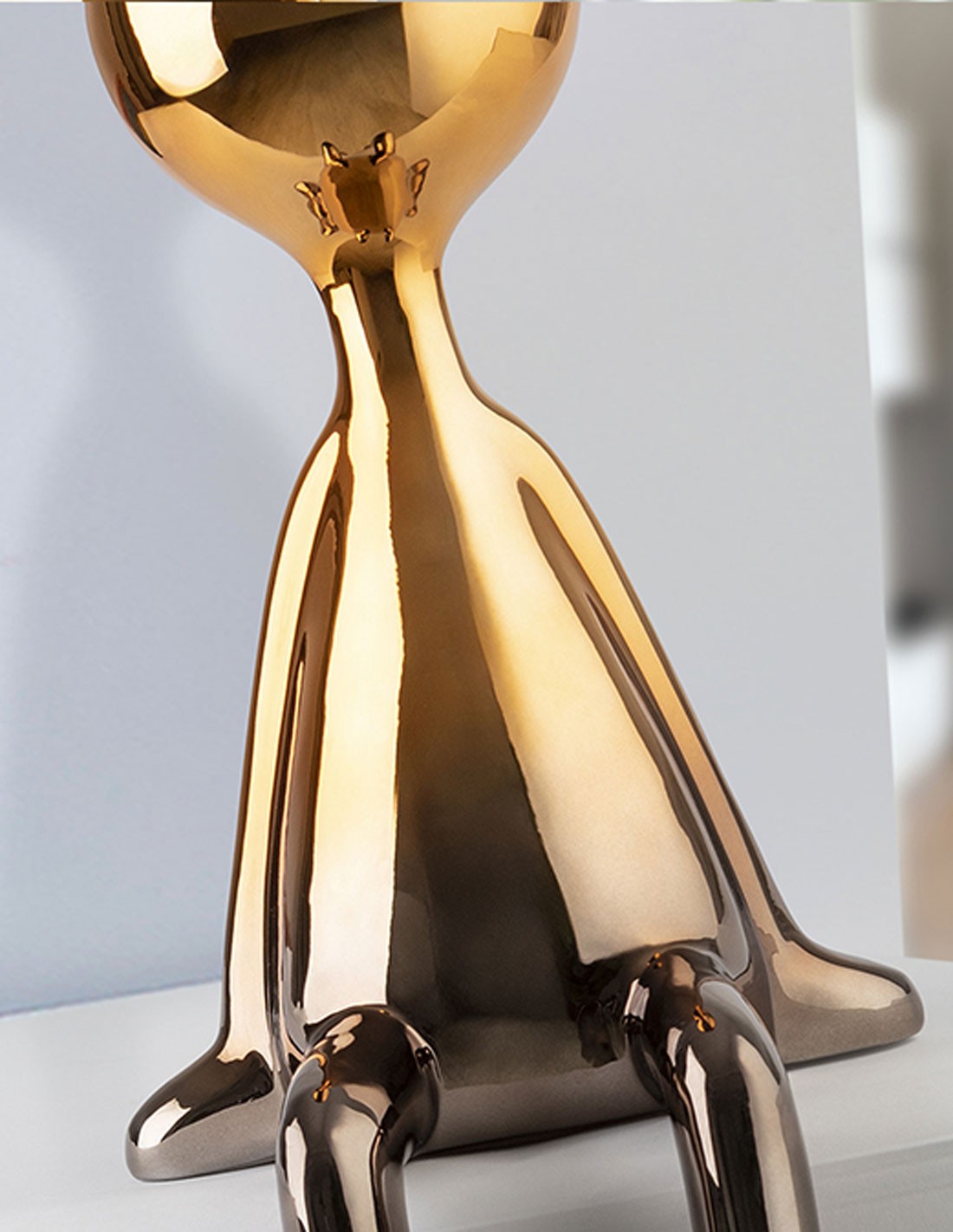 Figura sedente, realizado en resina acabado metalizado degradado de gris plomo a naranja.