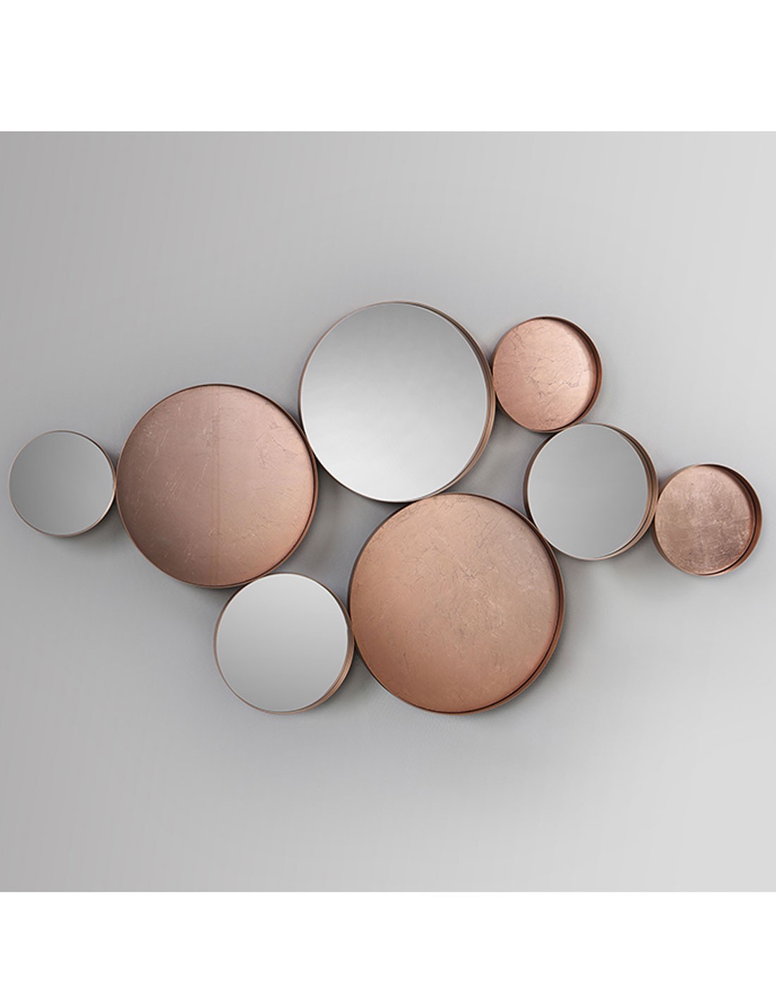 Espejo con marcos de metal en acabado oro rosa. Interiores con discos de espejo o cristal con fondo en pan de oro rosa. Medidas 164*90 cm.