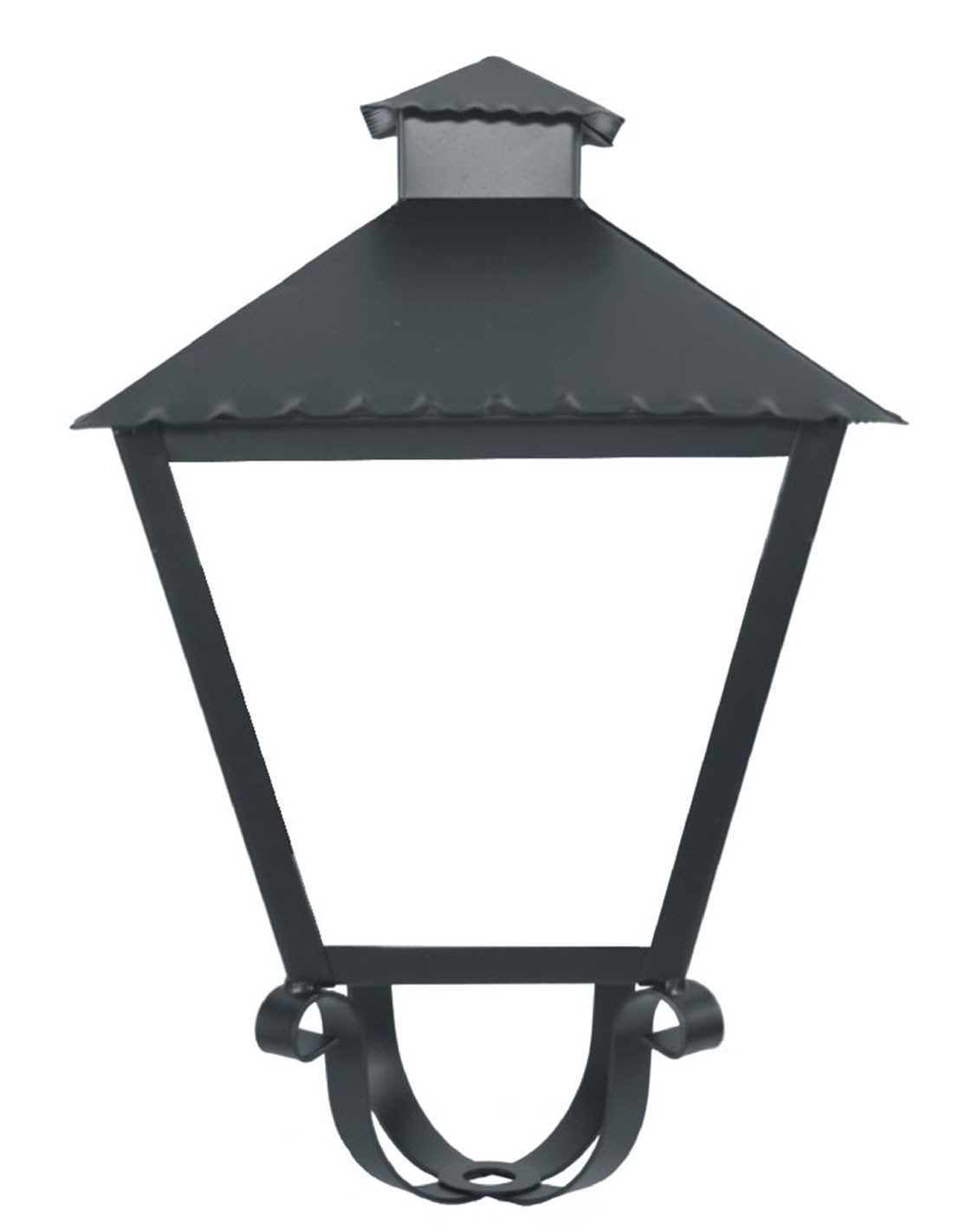 Cabezal para farol o aplique realizado en chapa de acero con remate superior de aluminio entallado acabado negro.