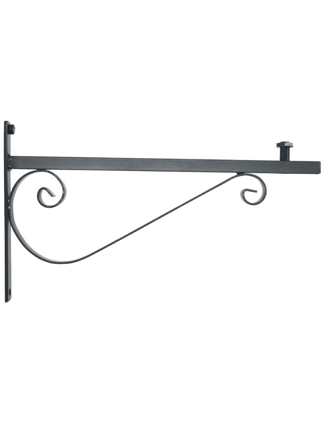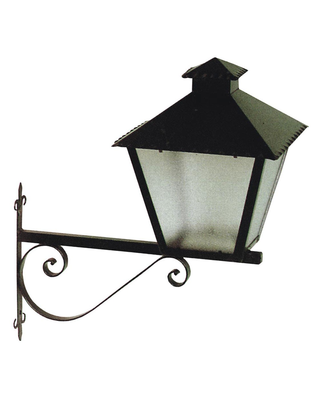 Farol de Pared negro en brazo con ornamento de pletina de hierro y tubo + cabezal sombrero soldado con doble tejado. Bombilla bajo consumo o led.