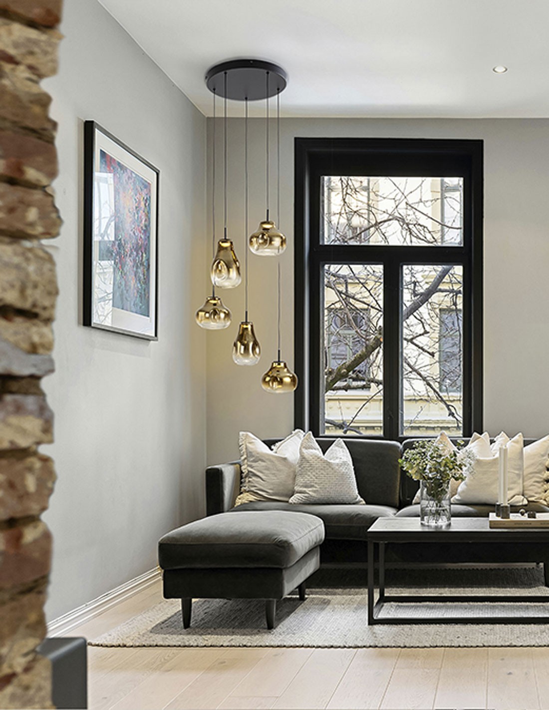 Disponible en colgante individual y lámpara de techo de 3, 4 y 5 luces.