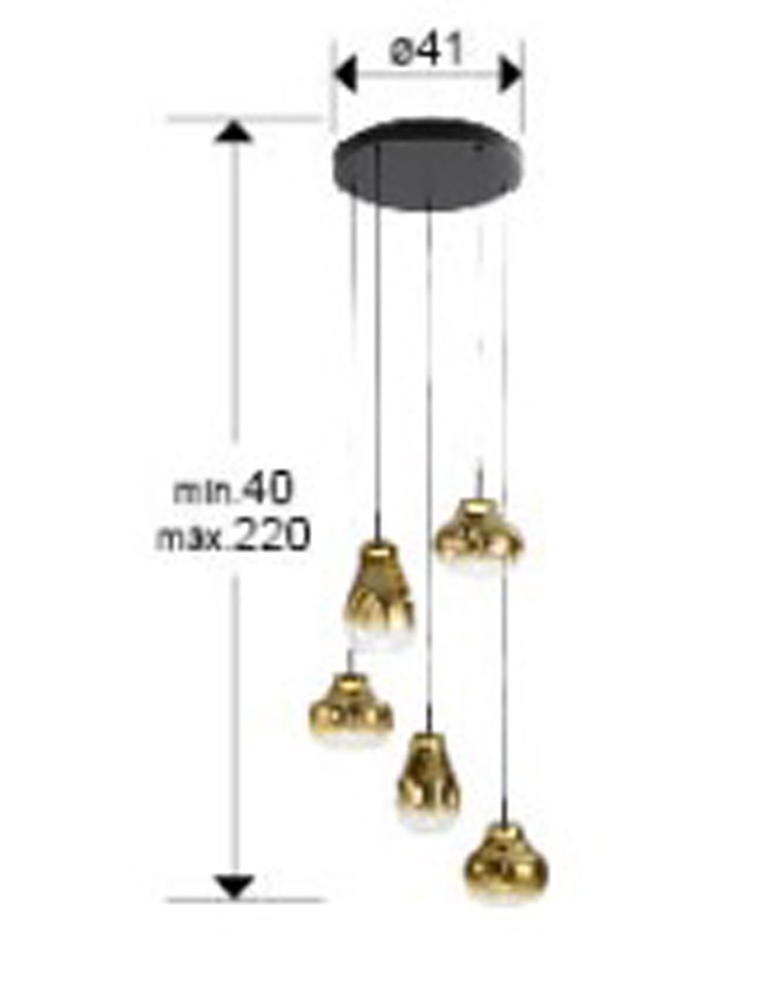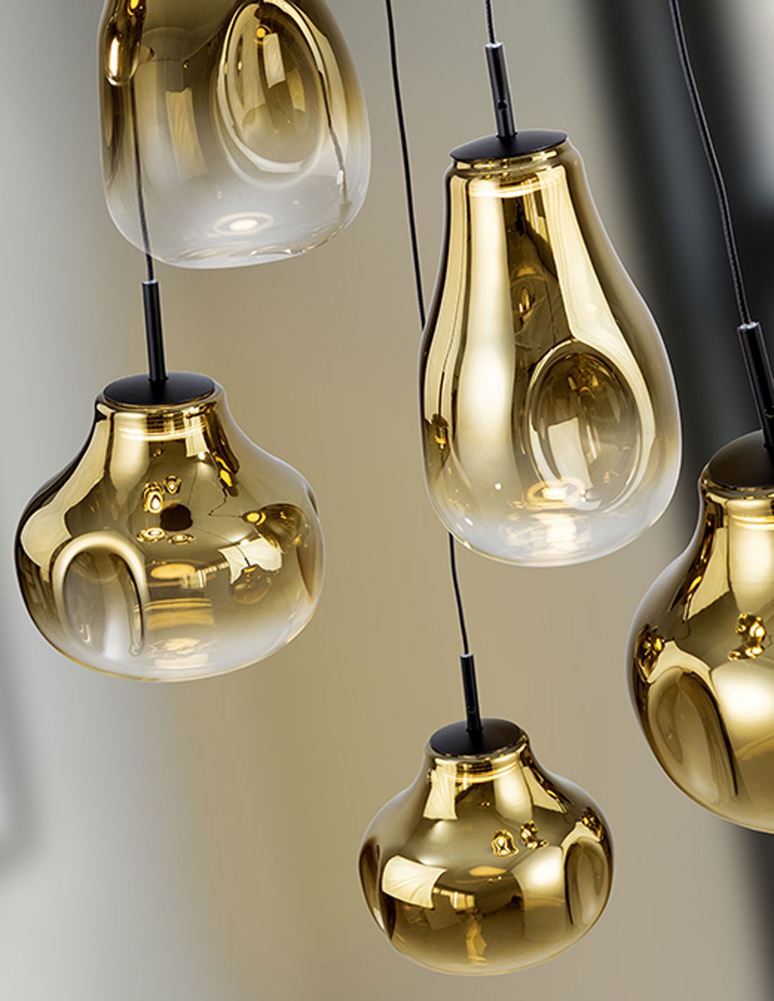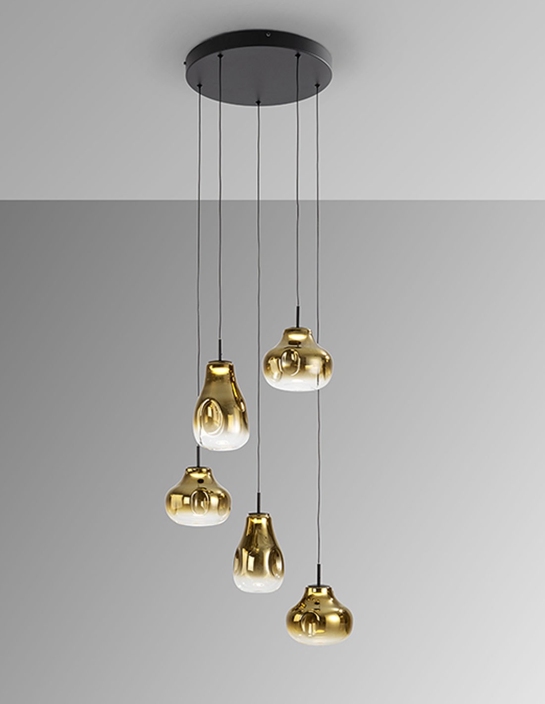 Lámpara de Techo de 5 luces realizada en metal acabado negro mate con tulipa de cristal soplado de dorado difuminado a transparente. Altura ajustable.