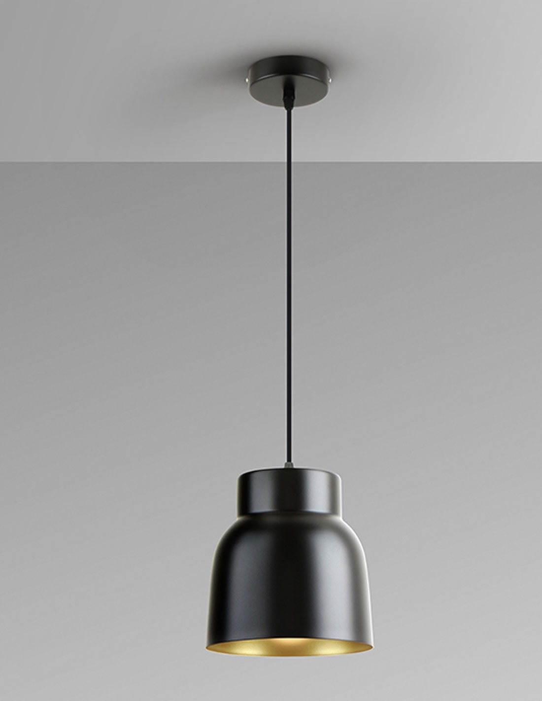 Lámpara de Techo con 1 luz de metal acabado negro mate interior dorado. Altura ajustable.