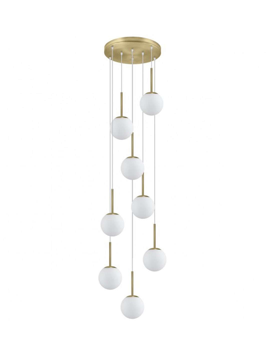 Lámpara de techo de 3 luces realizada en metal acabado latón con tulipas de cristal bolas opal. Altura ajustable. Diámetro 20 cm.