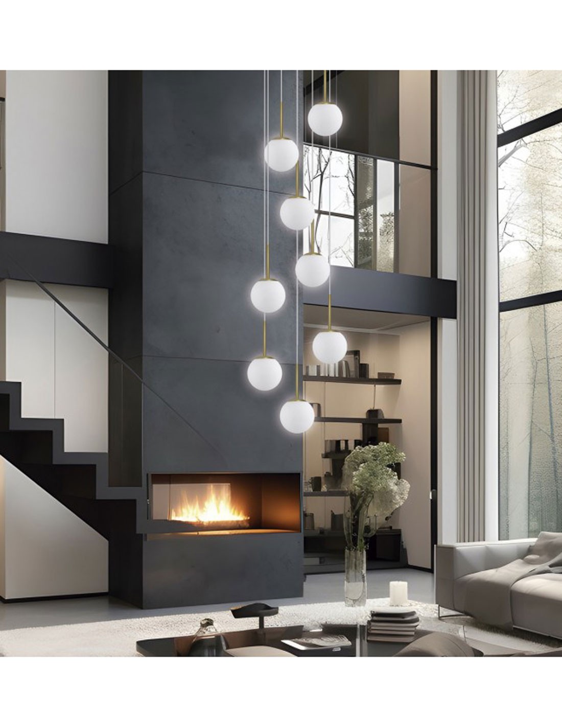Colección compuesta por lámpara de techo circular de 3, 5 y 8 luces, lámpara lineal de 4 luces y colgante individual en 2 tamaños.