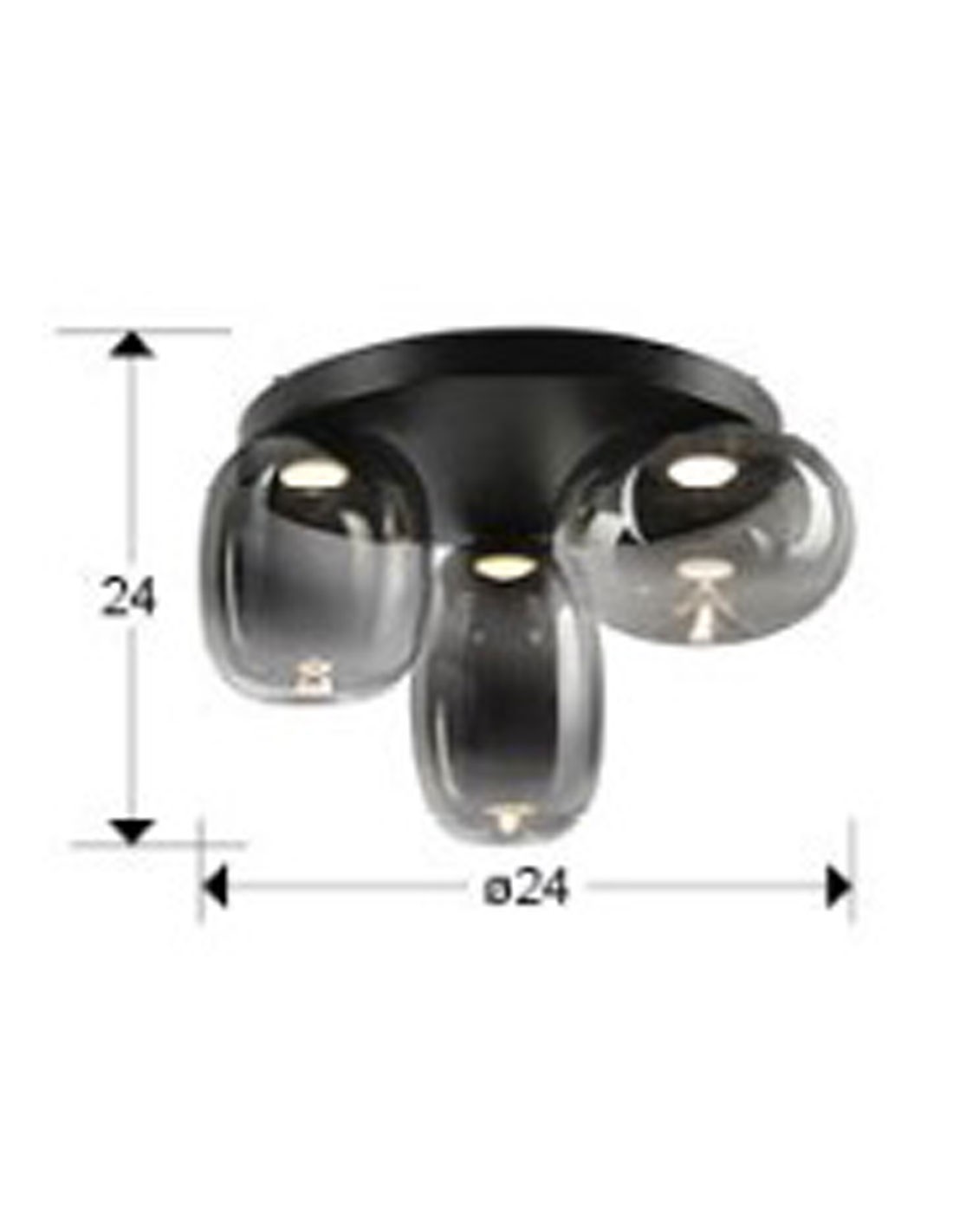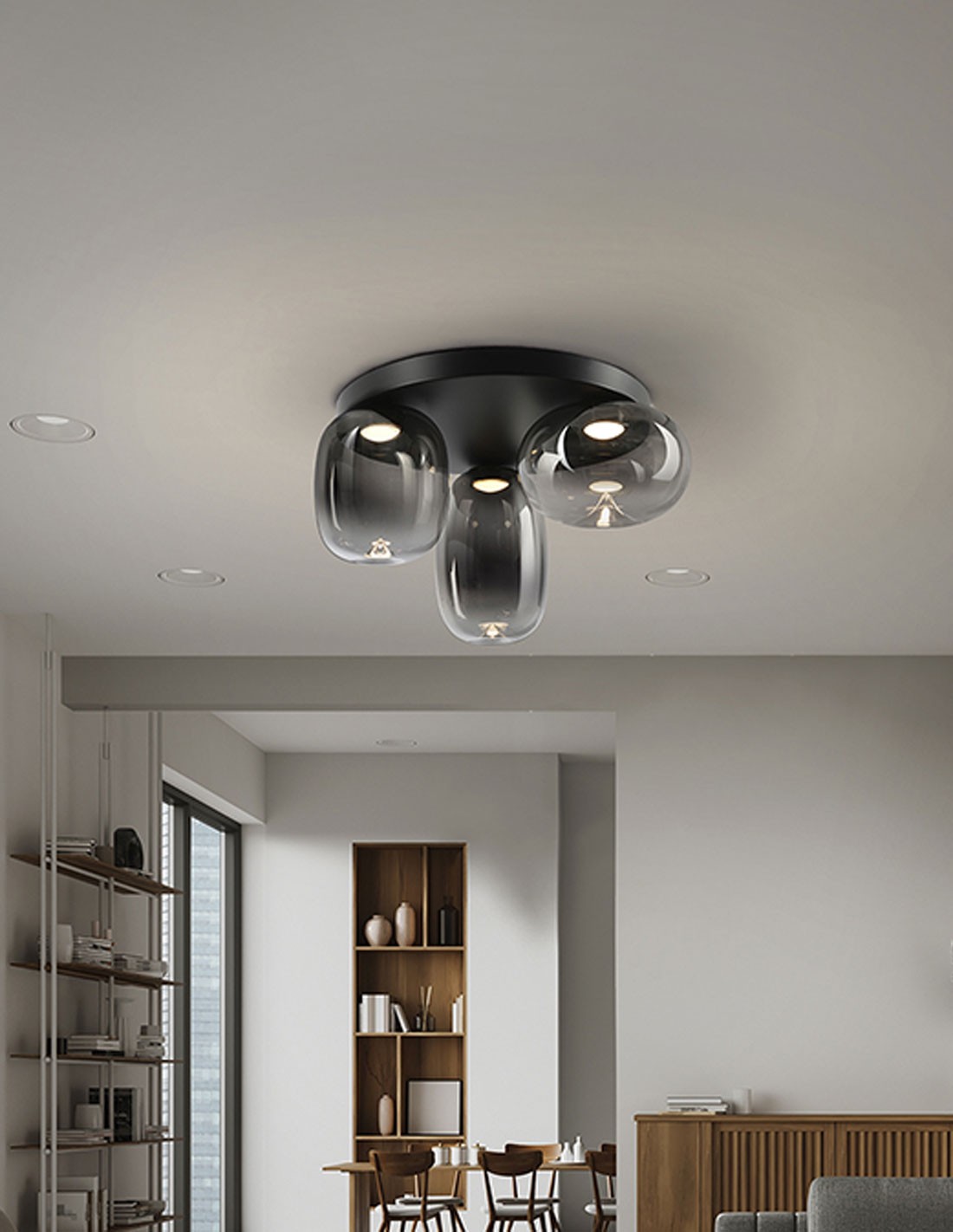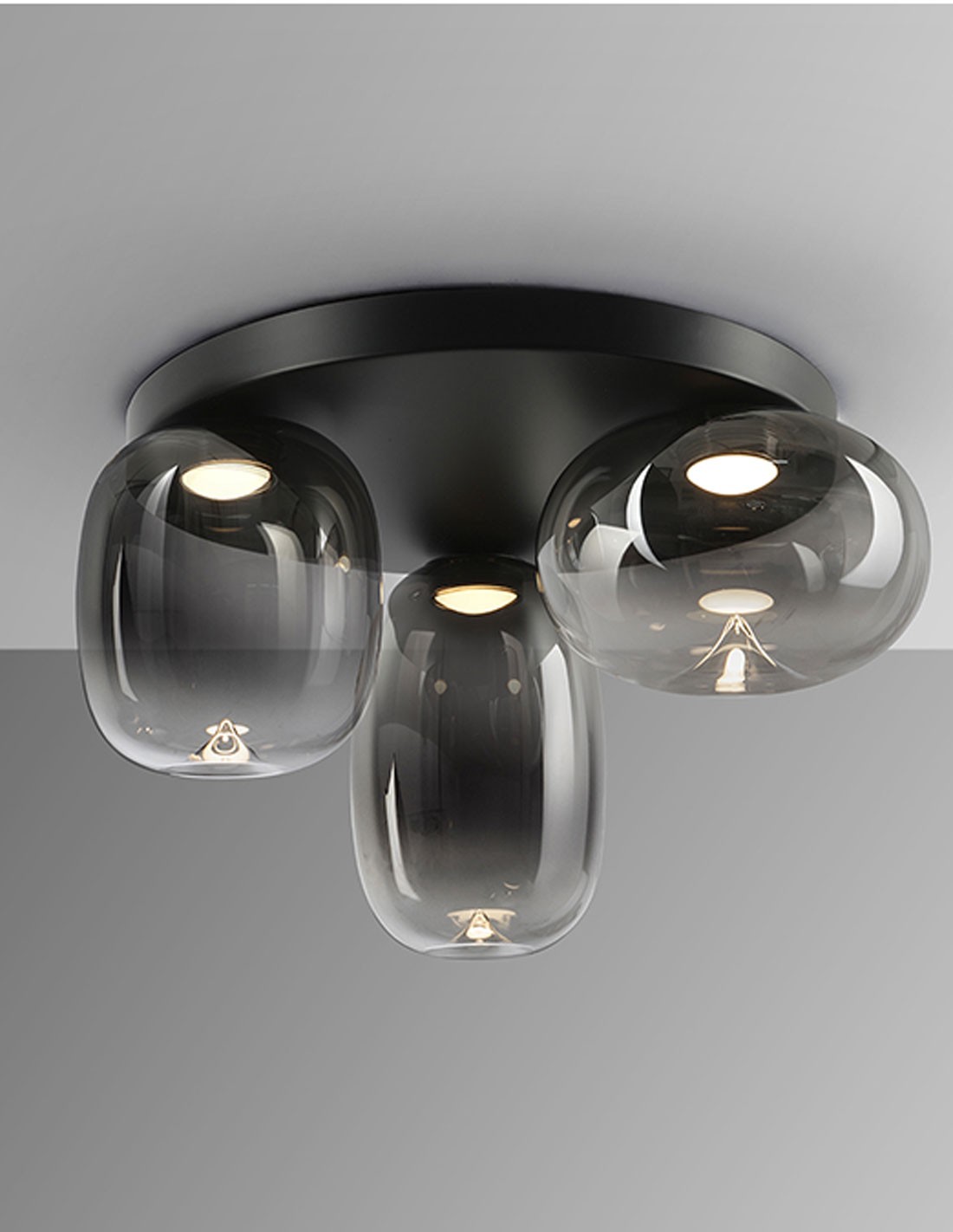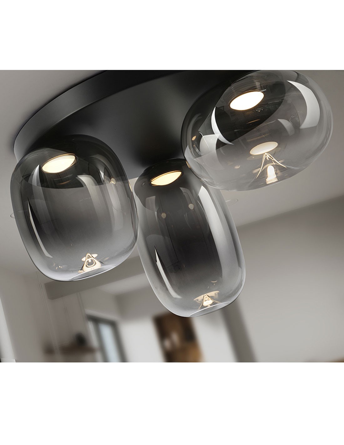 Plafón de Techo de 3 luces realizada en metal acabado negro con tulipas de cristal en gris smoke difuminado a transparente.