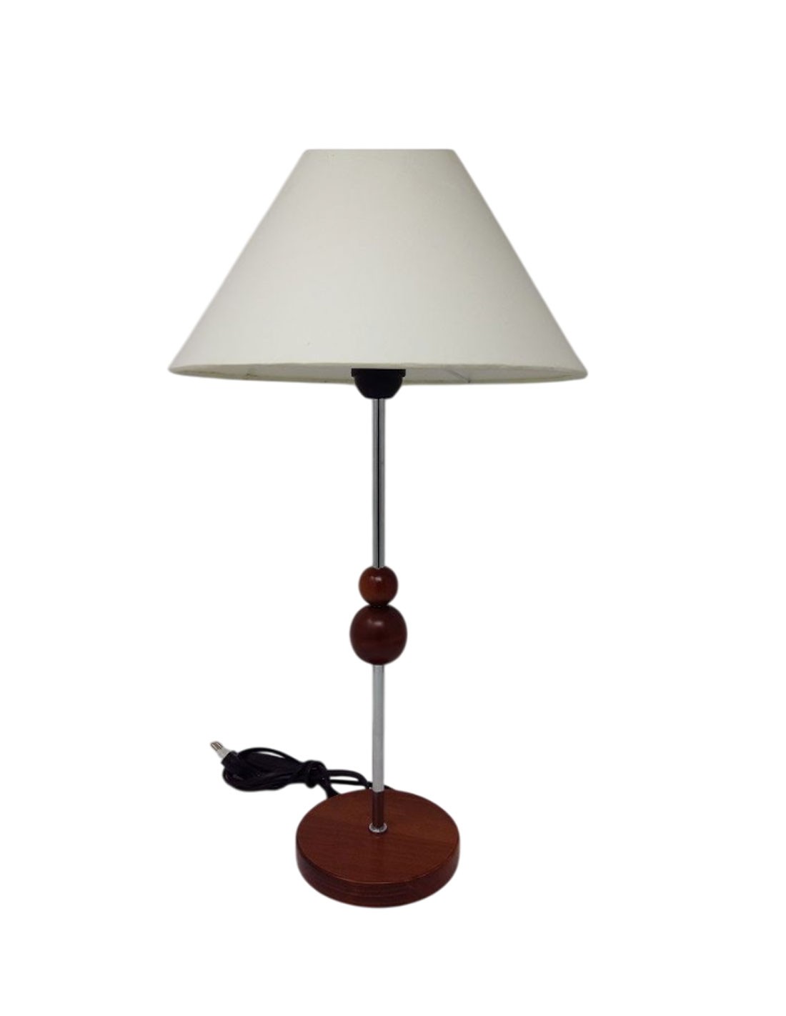 Lámpara de Sobremesa de metal con detalle bolas y base madera nogal de 1 luz y pantalla de tela.1*E14, admite luz led.Disponible acabado nogal y miel.