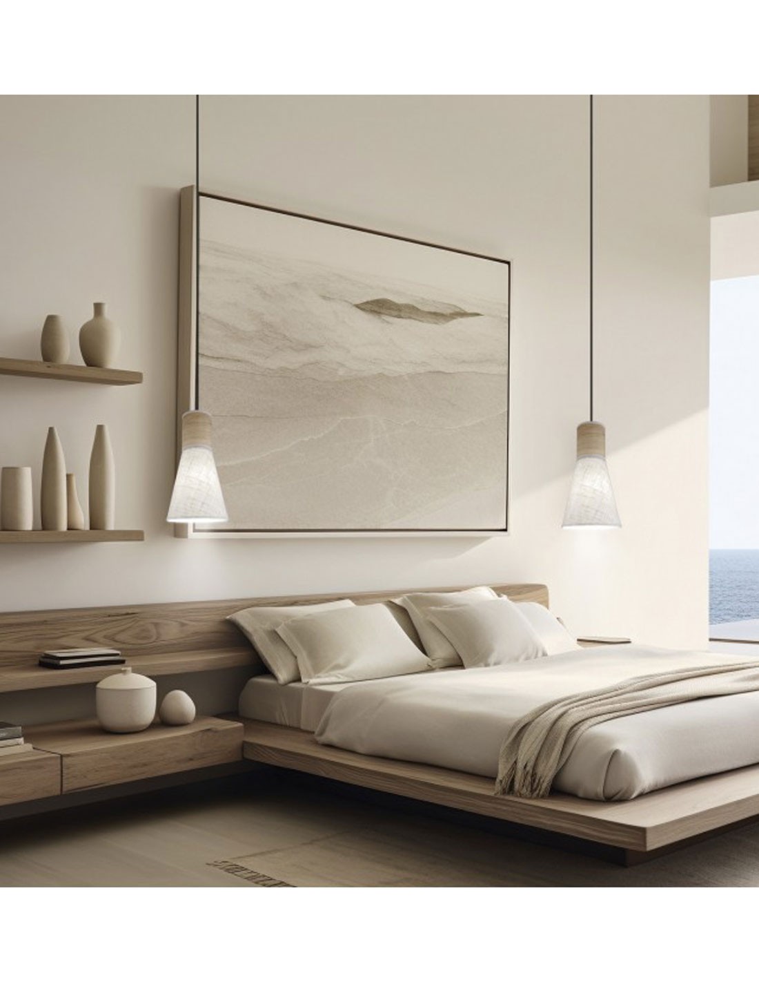 Lámpara de Techo Acabada en Tela tostada y madera.