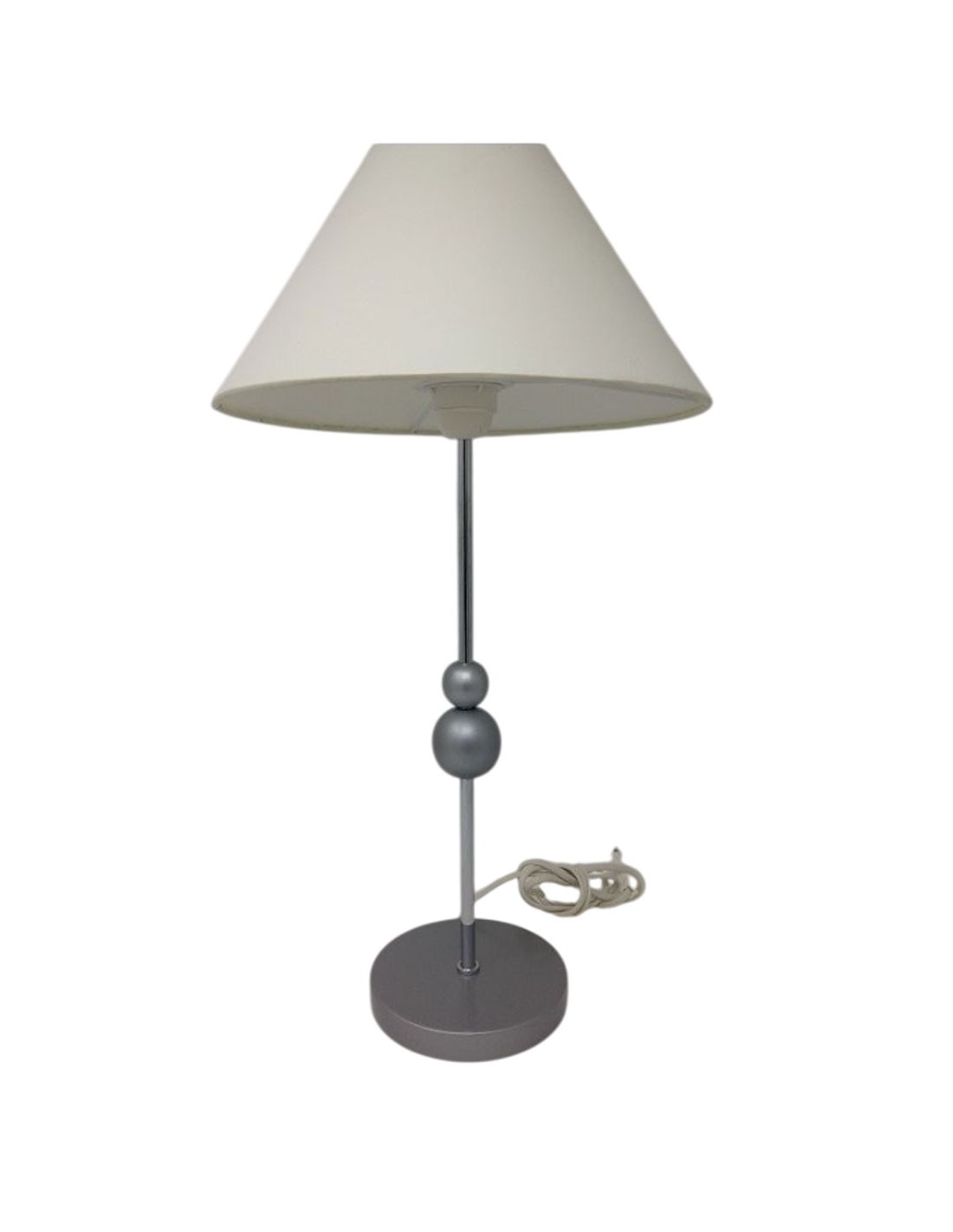 Lámpara de Sobremesa de metal con detalle bolas y base de madera plata de 1 luz y pantalla de tela. Alto 52 cm.