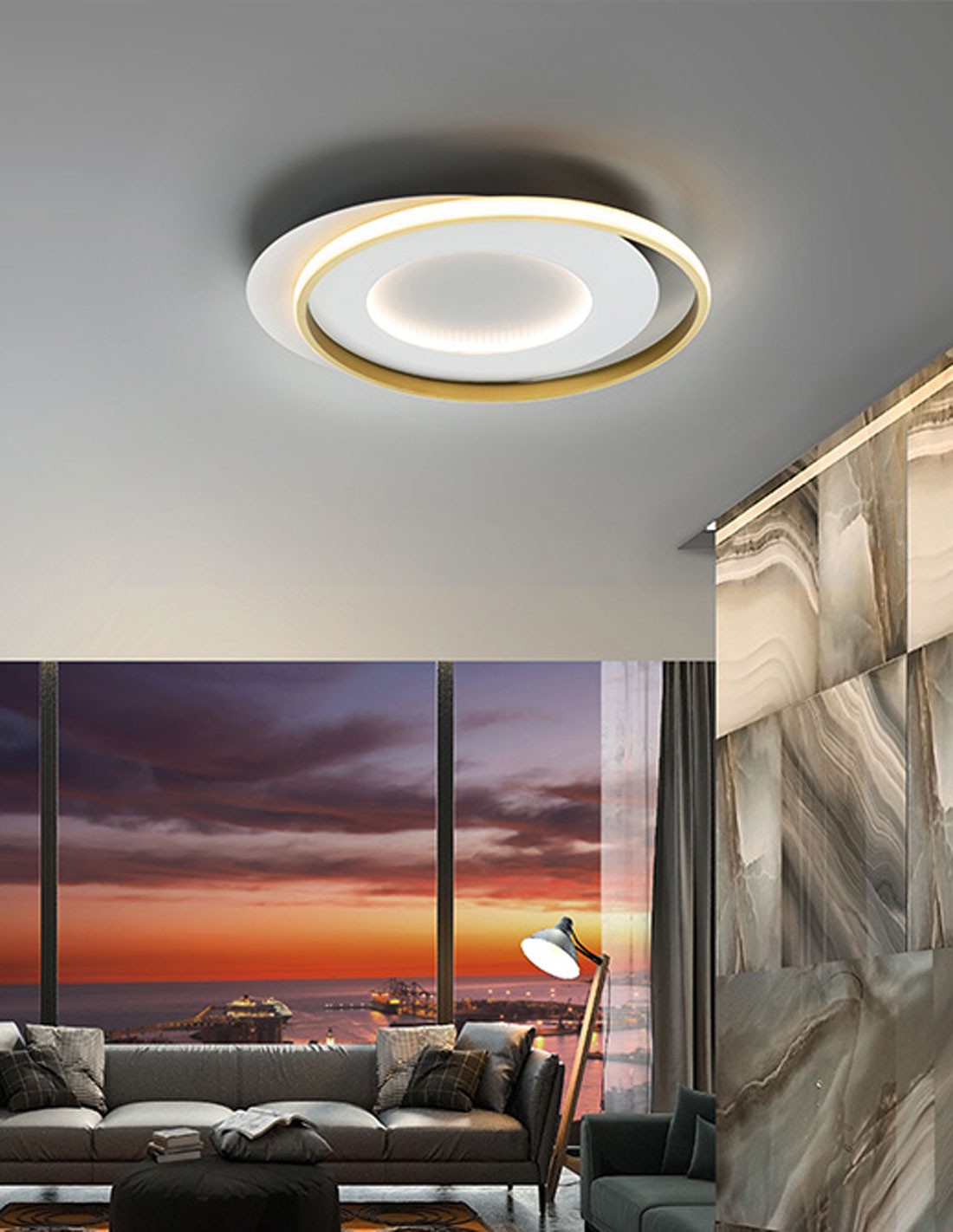 Plafón de Techo Led de metal y aluminio, acabado blanco y oro con difusor de silicona opal. Diámetro 55 cm