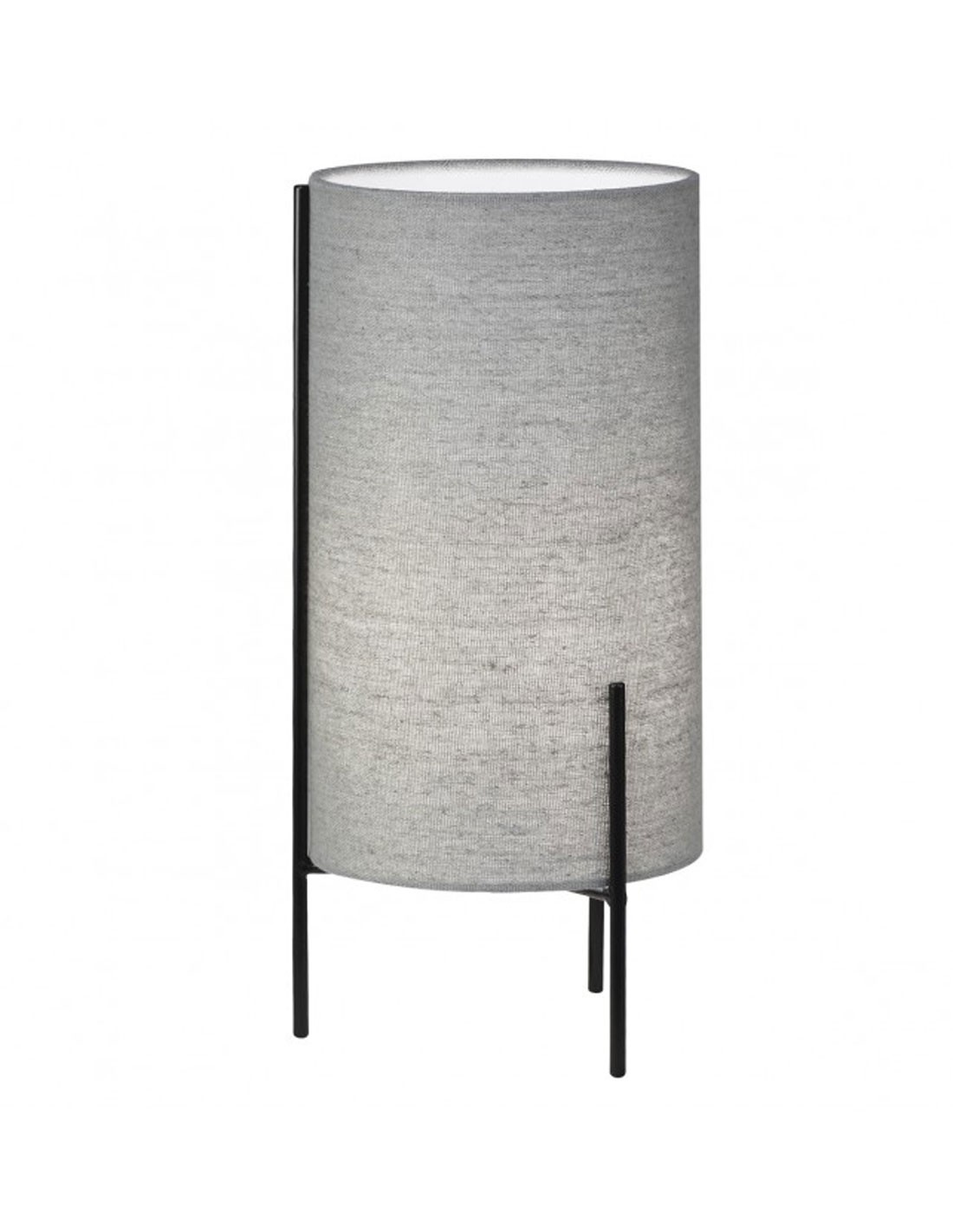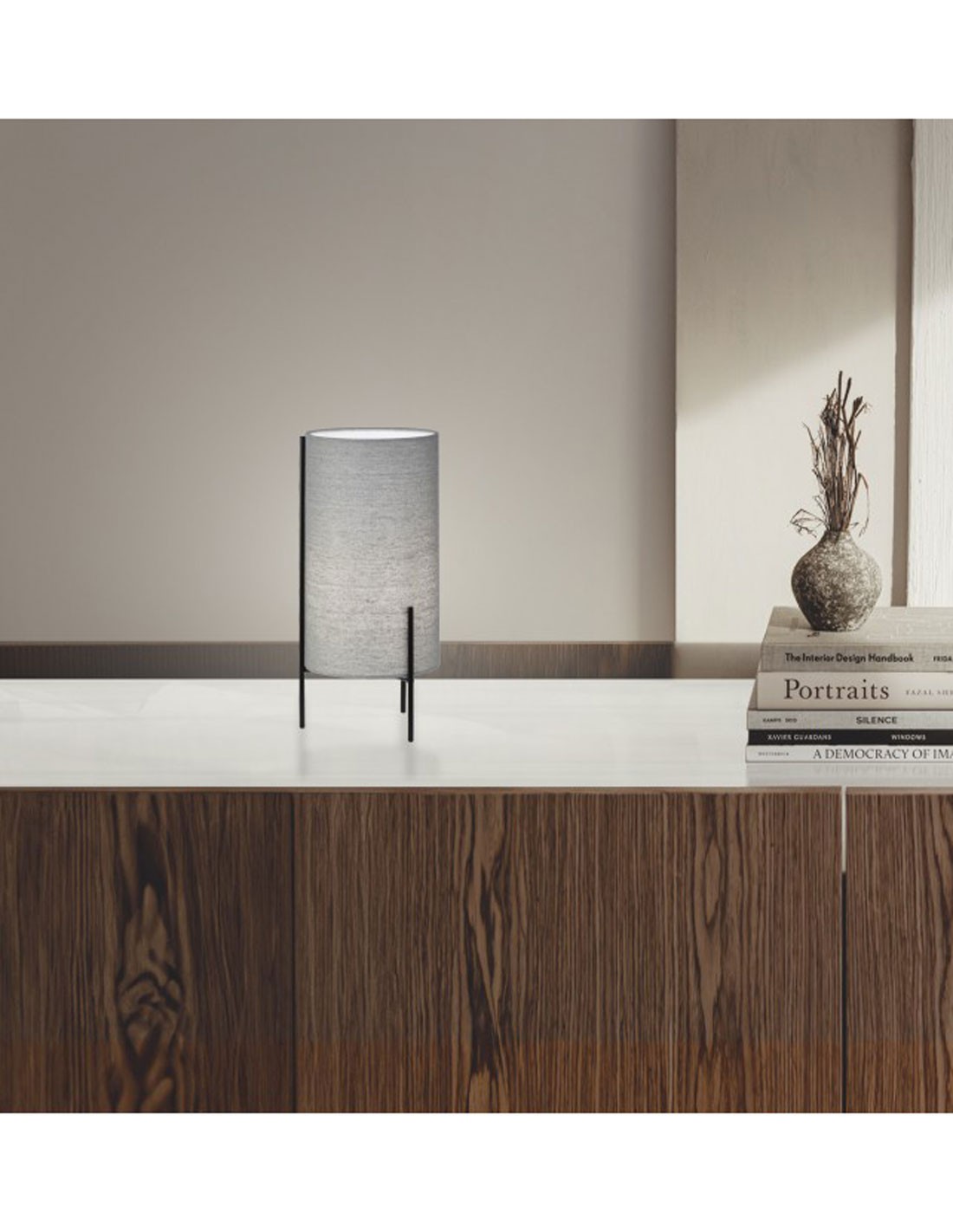 Lámpara de Mesa de metal acabado negro con pantalla textil gris de 13 cm de diámetro.