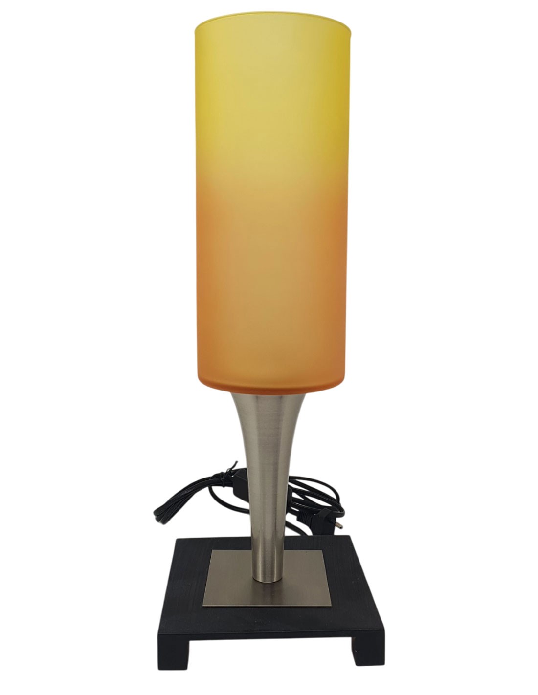 Lámpara de sobremesa de 1 Luz acabado wengué níquel con tulipa de cristal cilindro naranja.