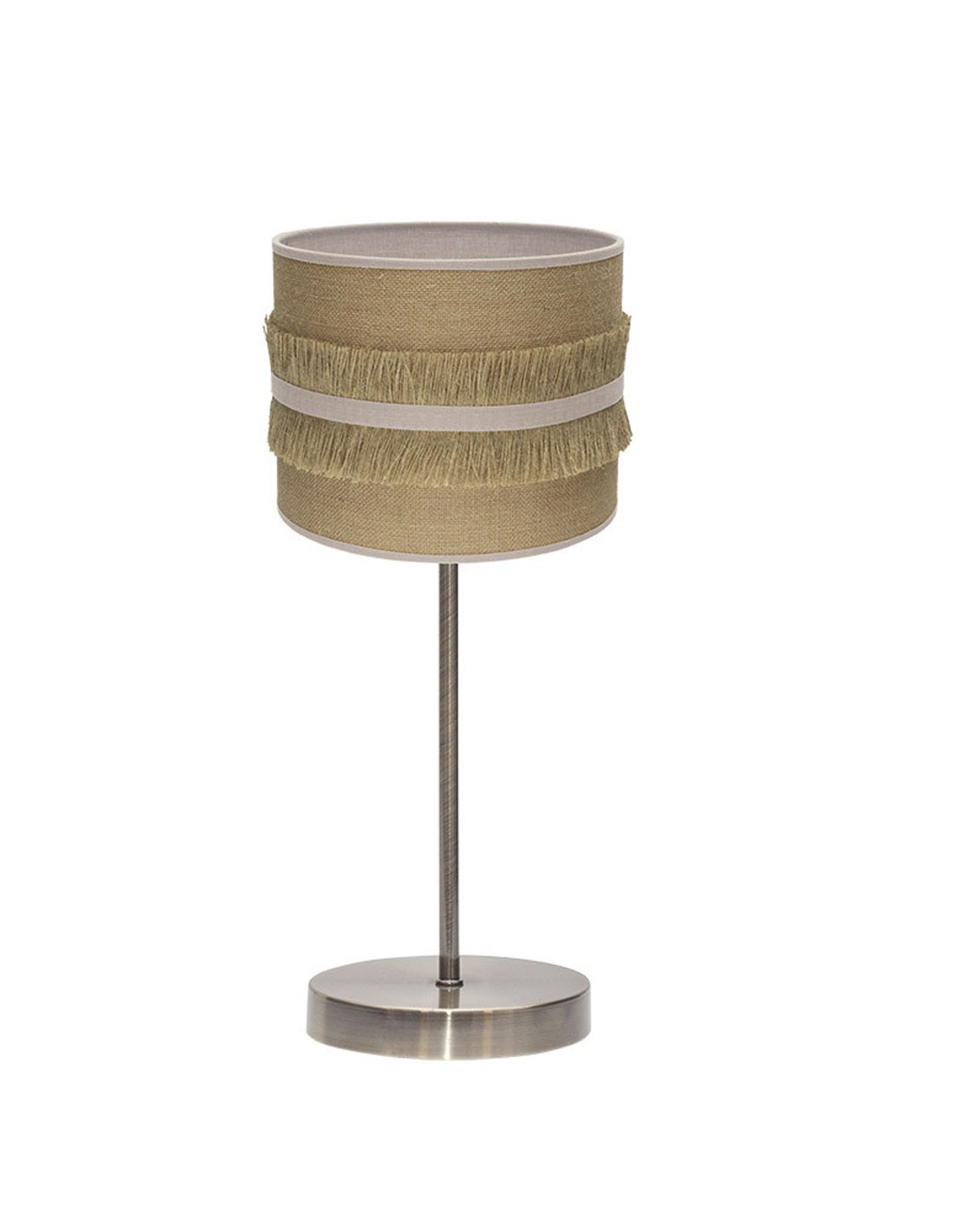 Lámpara Mesa de metal cuero acabada en pantalla de saco con terminación en tela de lino beig y pasamanería.