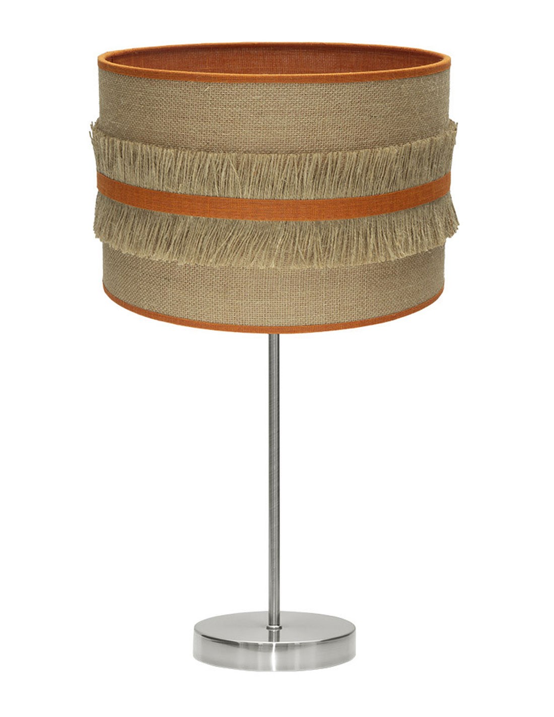 Lámpara Mesa alta de metal níquel, acabada en pantalla de saco con cinta de tela lino naranja y pasamanería.