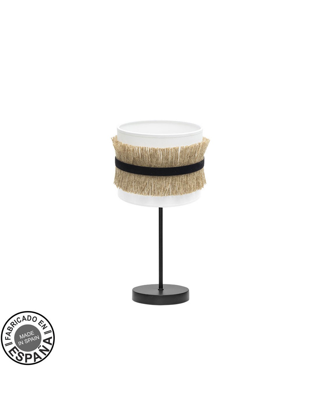 Lámpara sobremesa de 1 luz acabado negra con pantalla blanca combinada con yute y cinta negra de terciopelo. Diámetro 17 cm.