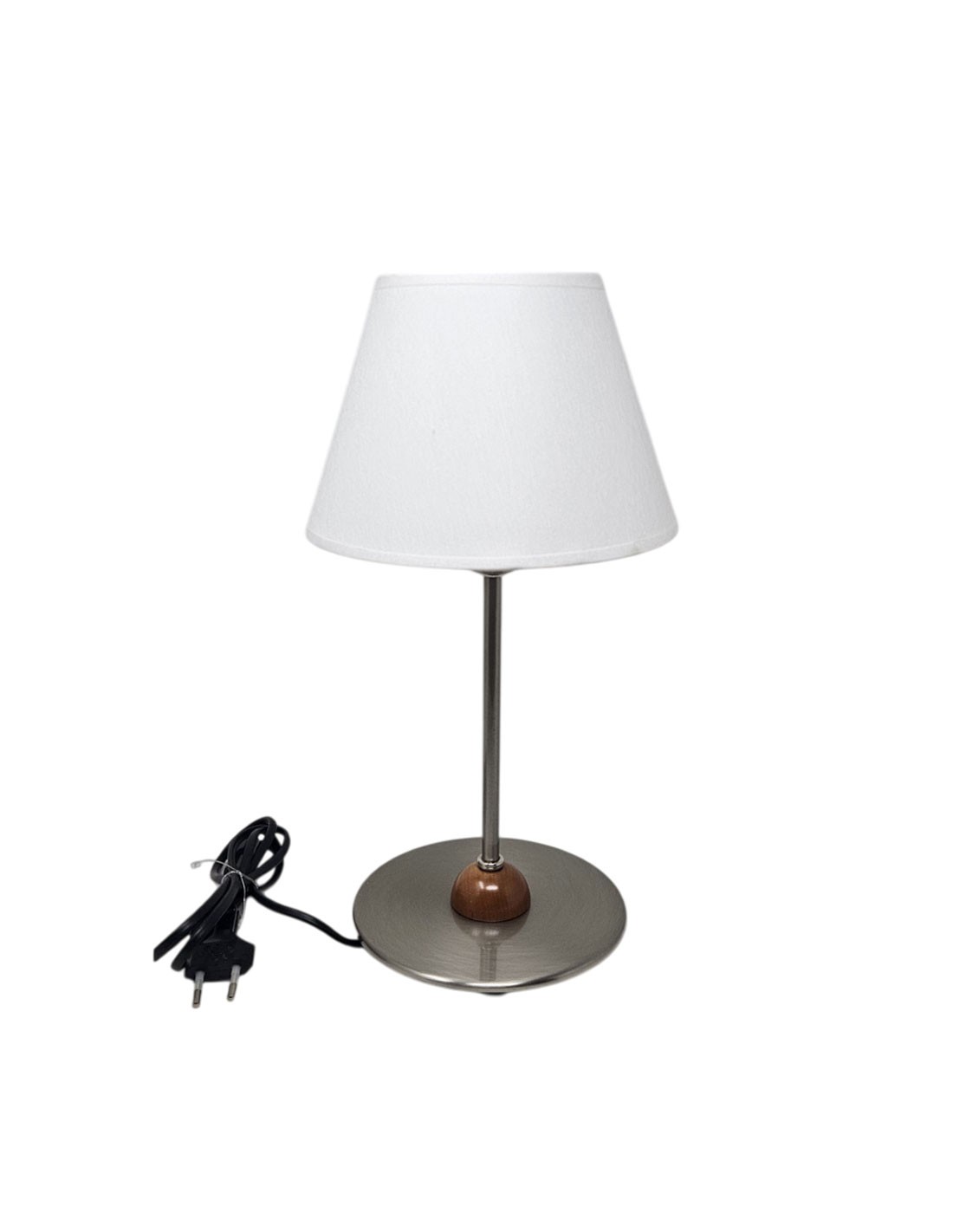 Lámpara de sobremesa de 1 Luz acabado níquel satinado con decoración madera media bola miel y pantalla textil.