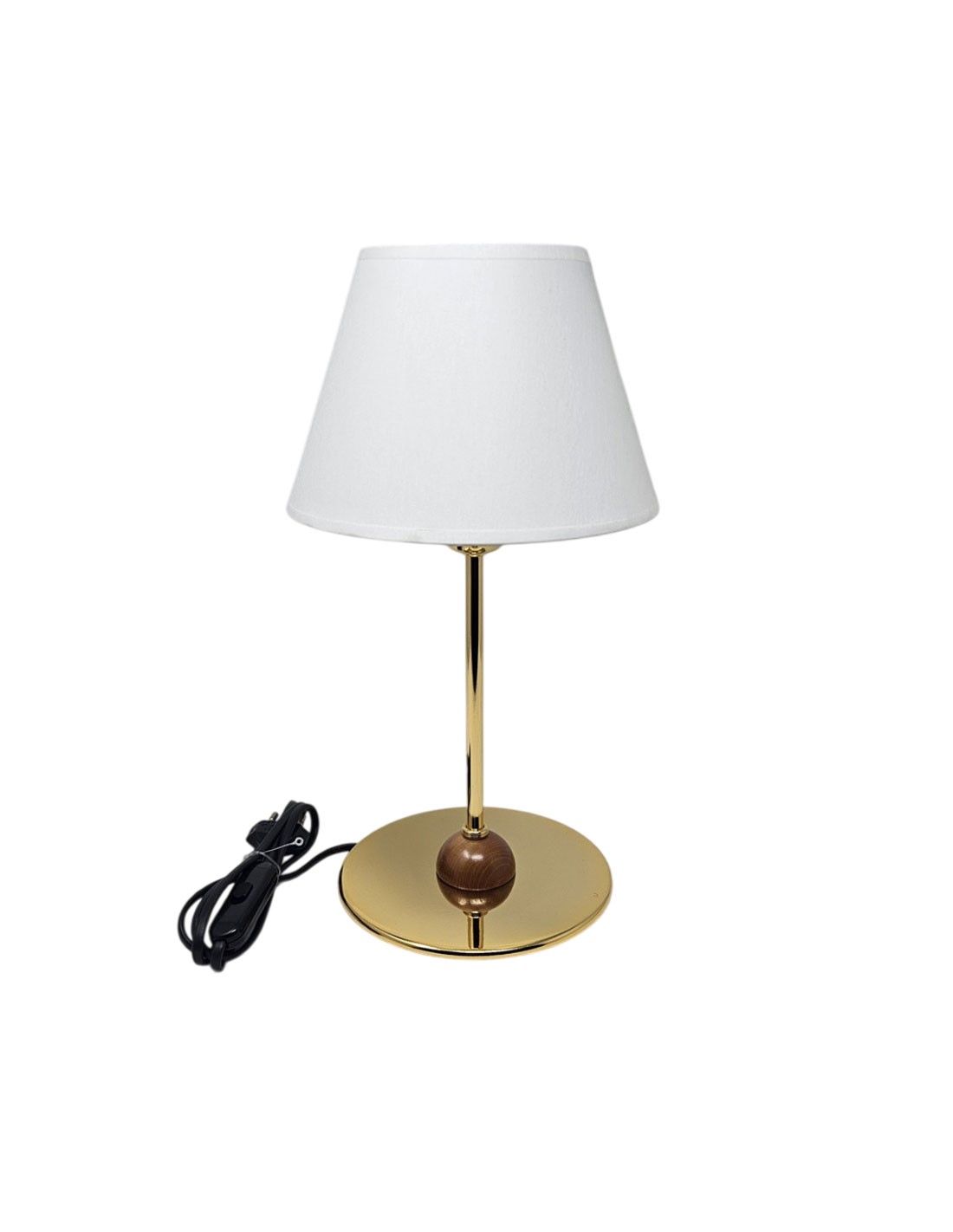 Lámpara de sobremesa de 1 Luz acabado níquel satinado con decoración madera miel y pantalla textil.