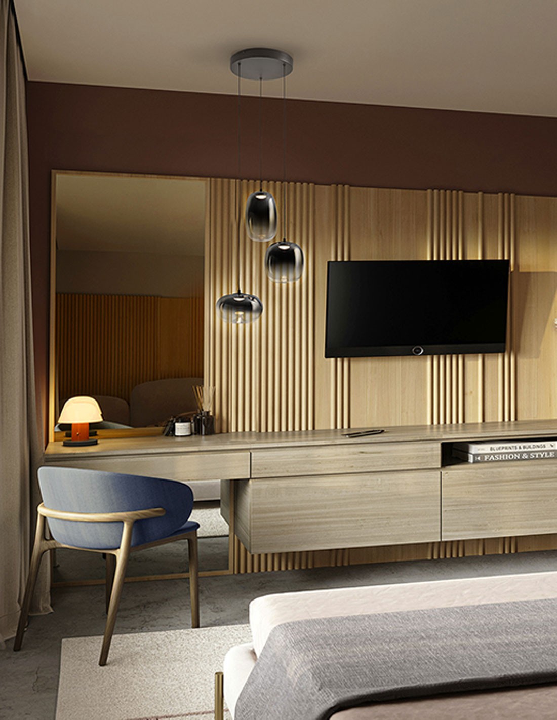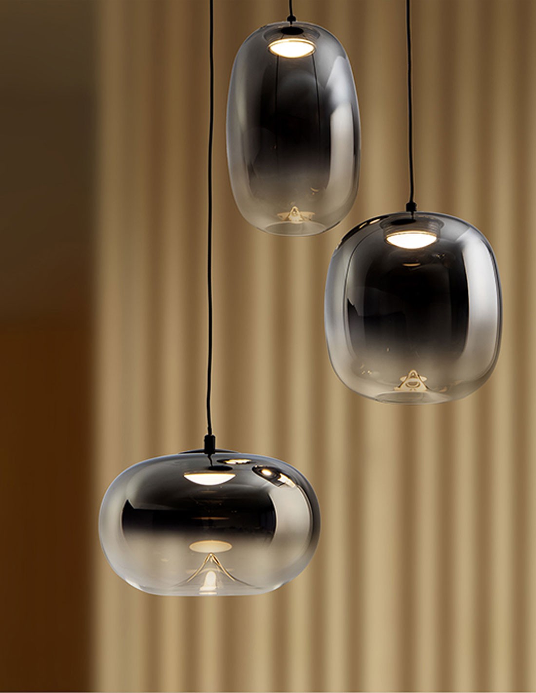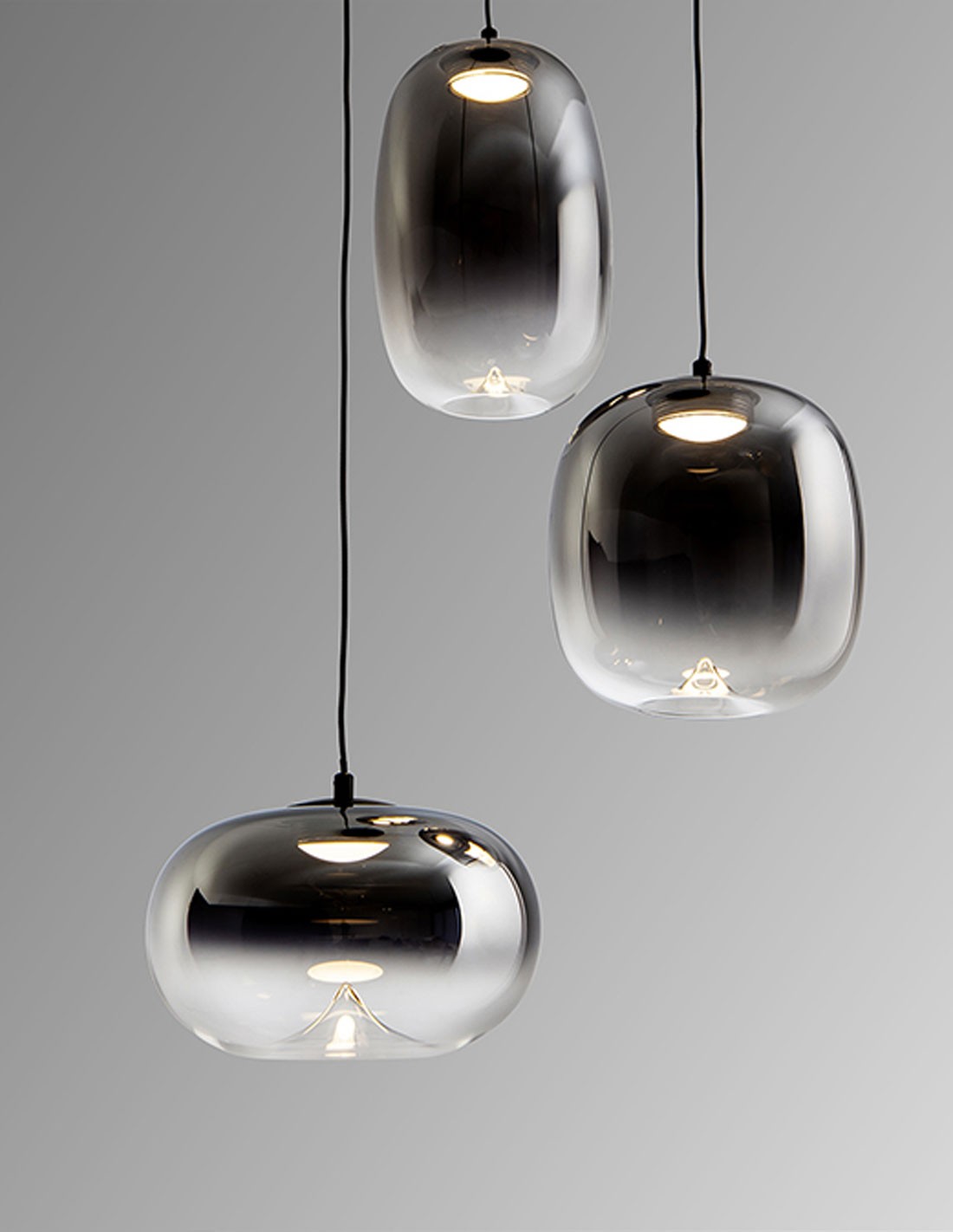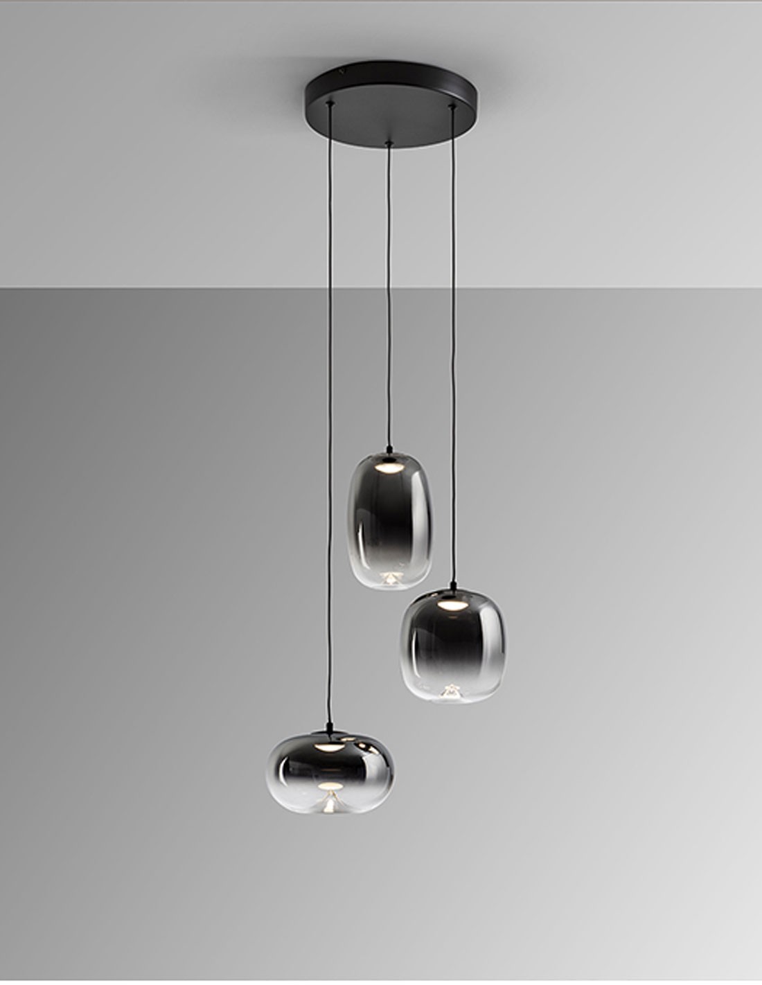 Lámpara de Techo de 3 luces realizada en metal acabado negro con tulipas de cristal en gris smoke difuminado a transparente. Altura ajustable.