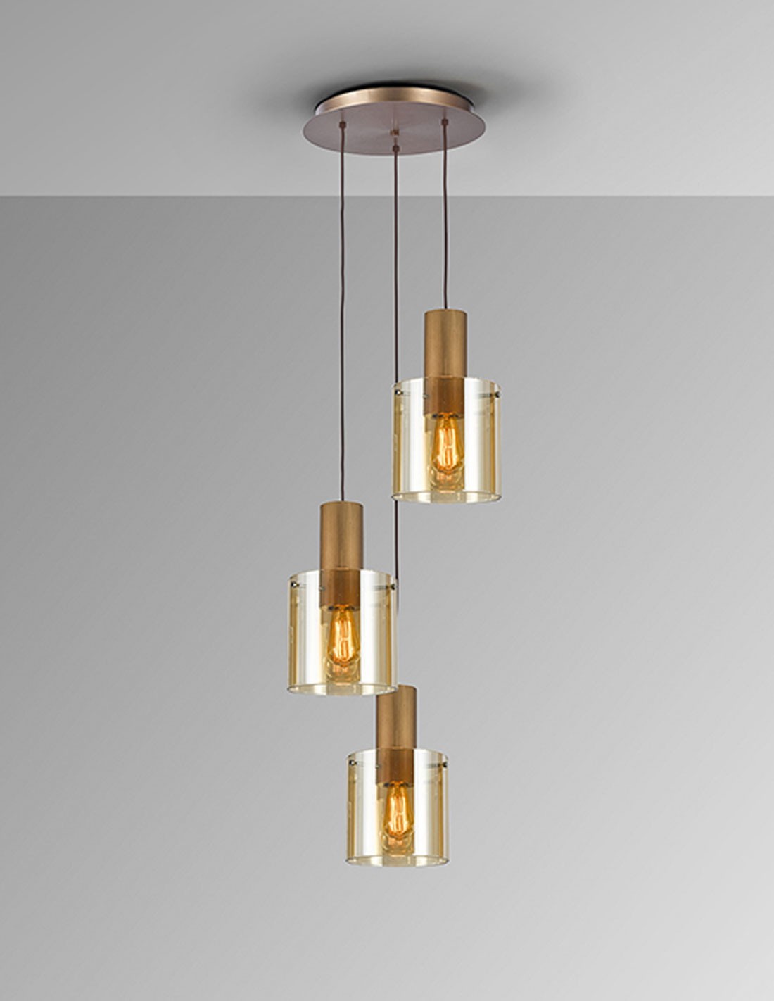 Lámpara de Techo de metal acabado en cobre satinado con tulipas de cristal ámbar y cable textil. Diámetro 37 cm. Altura ajustable.