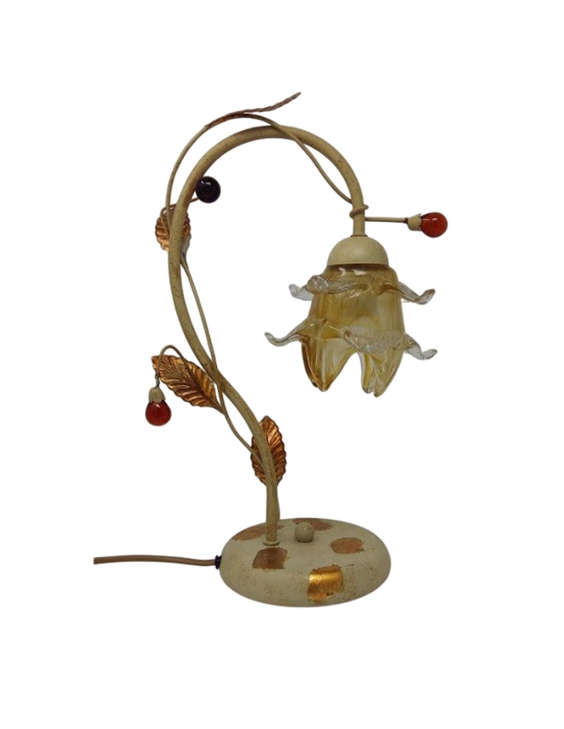 Sobremesa de 1 luz de metal con ramas acabado marfil oro y tulipa de cristal blanco beteado-oro. Alto 34 cm.