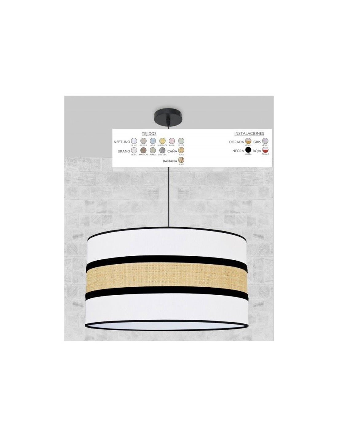 Lampara de techo colgante de 40 cm realizado en tela perla y caña con cinta negra.