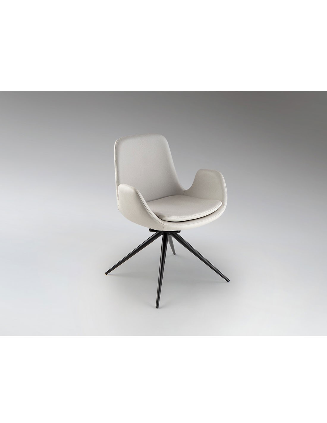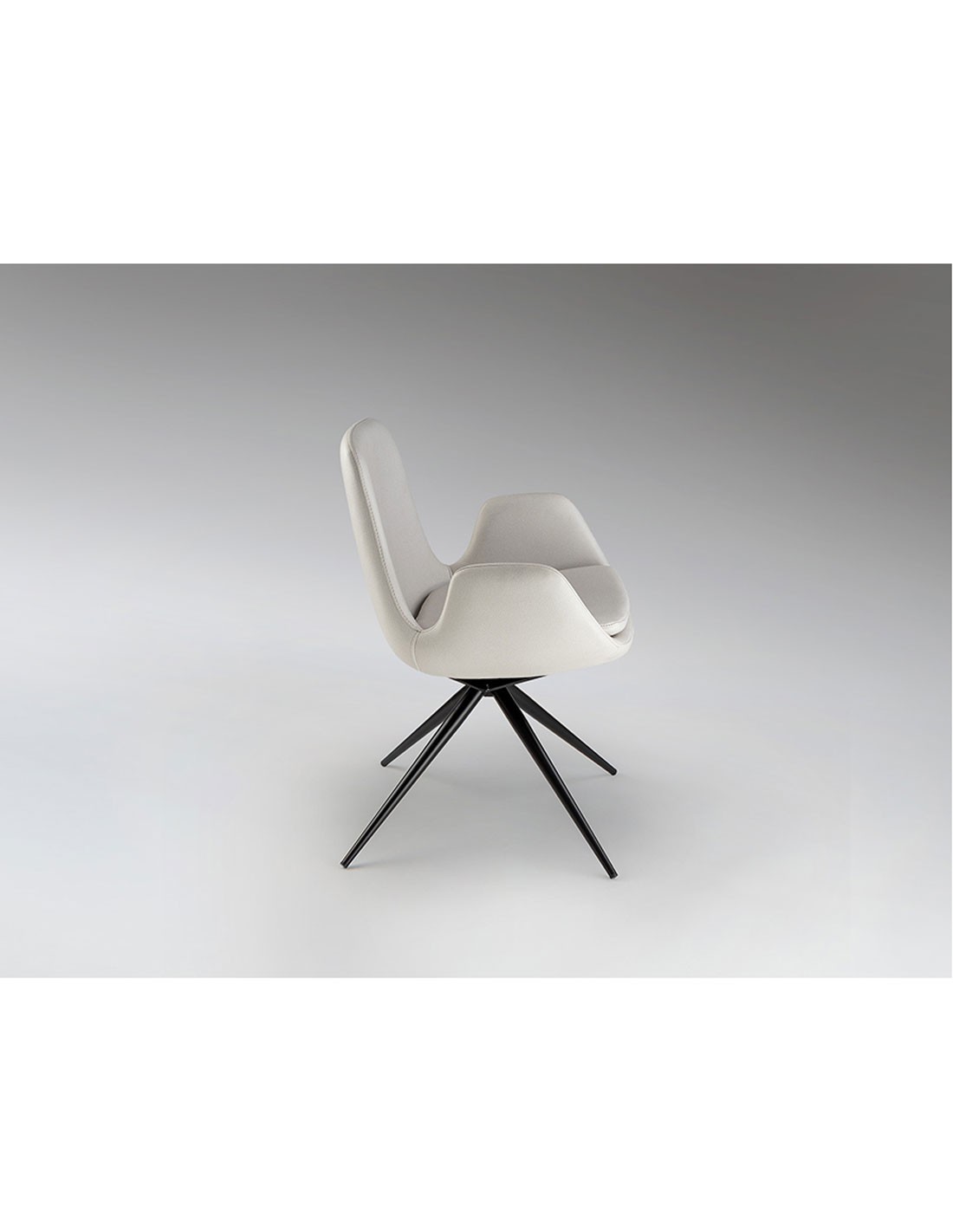 Silla giratoria, realizada en metal, acabado negro mate. Asiento y respaldo de madera contrachapada y espuma. Mecanismo giratorio con retorno automático.