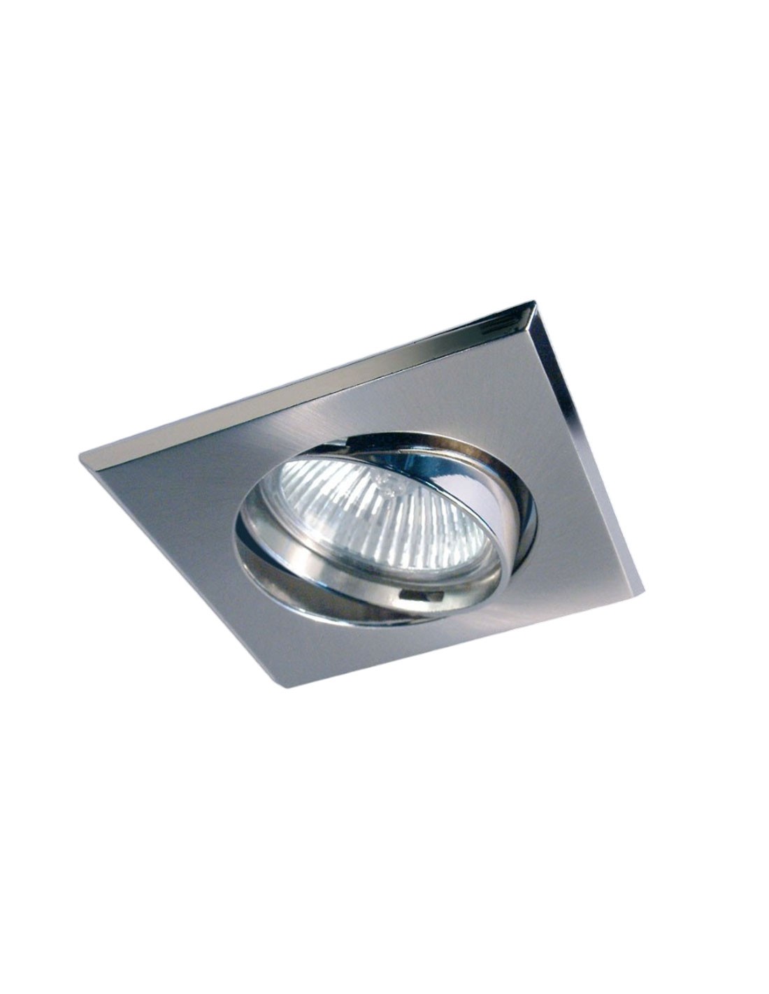 Foco de Empotrar orientable de aluminio blanco cromo con esquinas canteadas. Medida 9.3cm Exterior, casquillo GU10 Incluido.