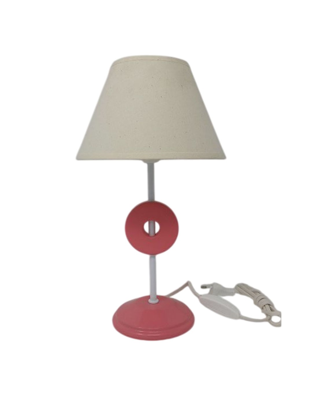 Lámpara de Sobremesa de metal con círculo en color rosa y blanco de 1 luz y pantalla de tela.