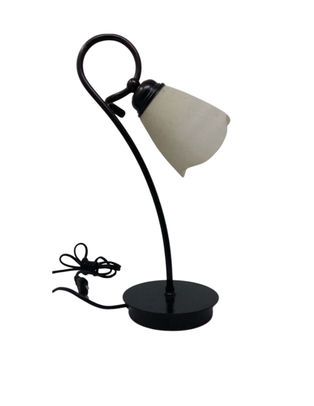 Sobremesa de 1 luz de metal acabado forja negra patina verde con tulipa de cristal decorada. Alto 36 cm.
