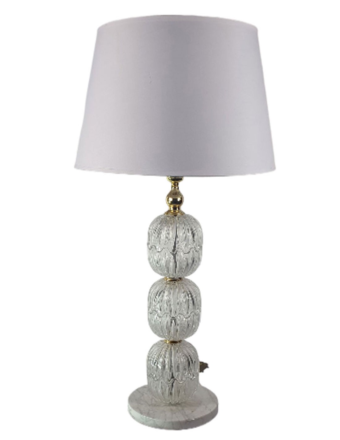 Sobremesa de 1 Luz realizado en metal baño dorado con columna de mármol y pantalla de tela. Lámparas fabricadas en España.