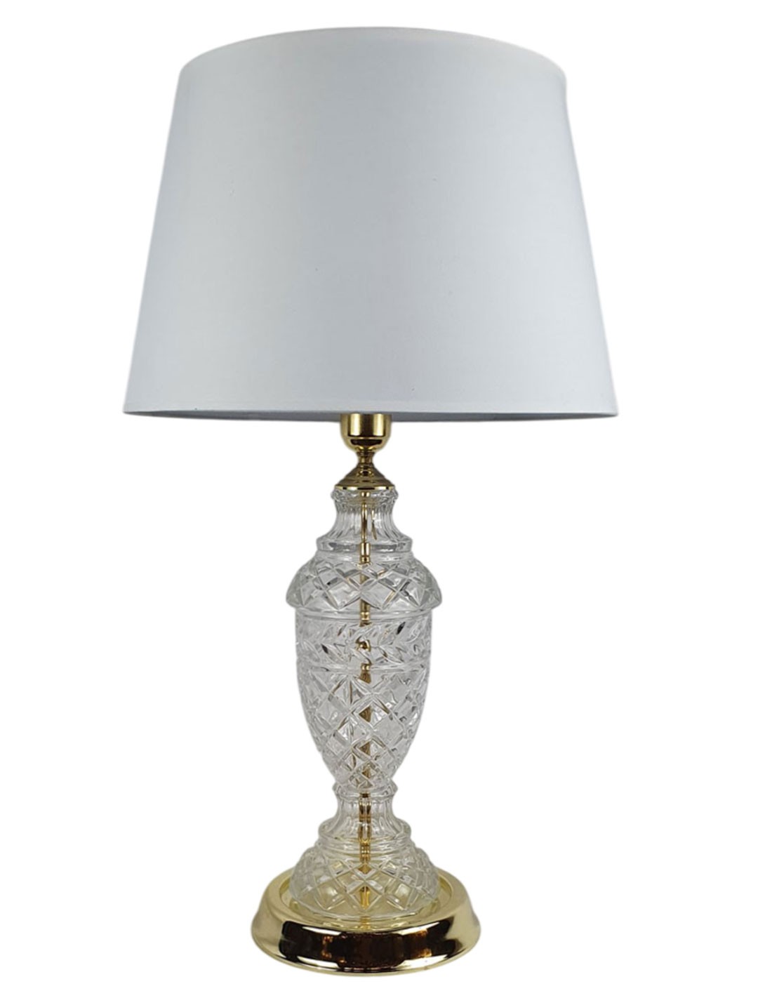 Lámpara Rinconera de 1 luz acabada en metal dorado y cristal plomo tallado. Pantalla Textil de 40 cm de diámetro.