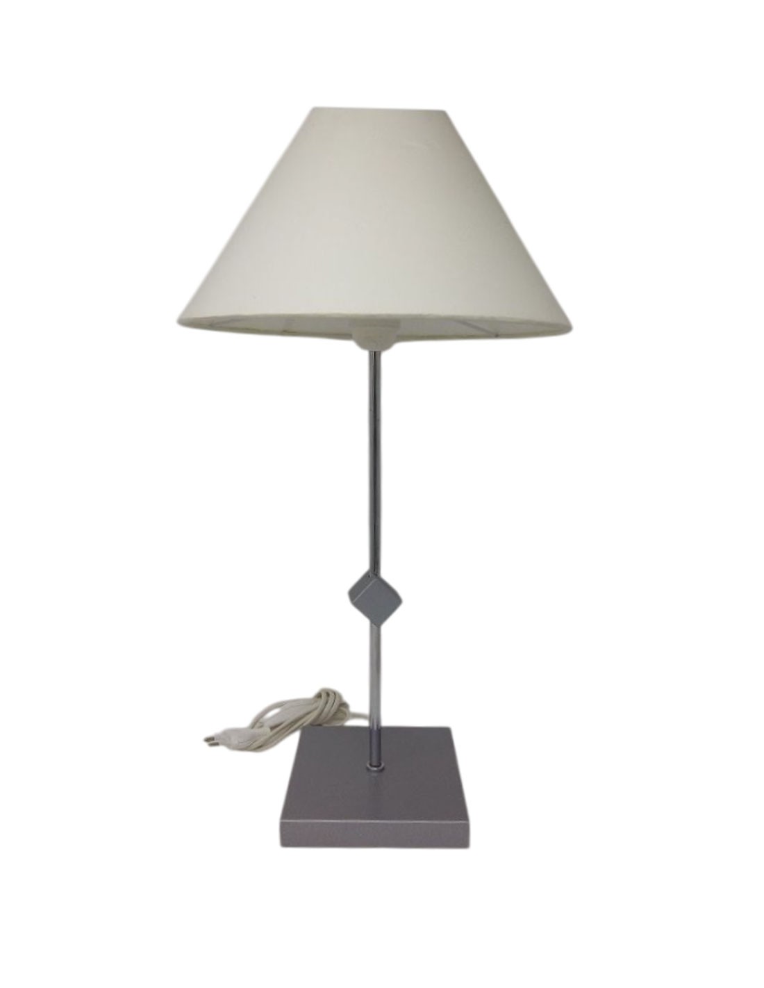 Lámpara de Sobremesa de metal acabado niquel 1 luz y pantalla de tela. Cuadrado central y base de madera plata.