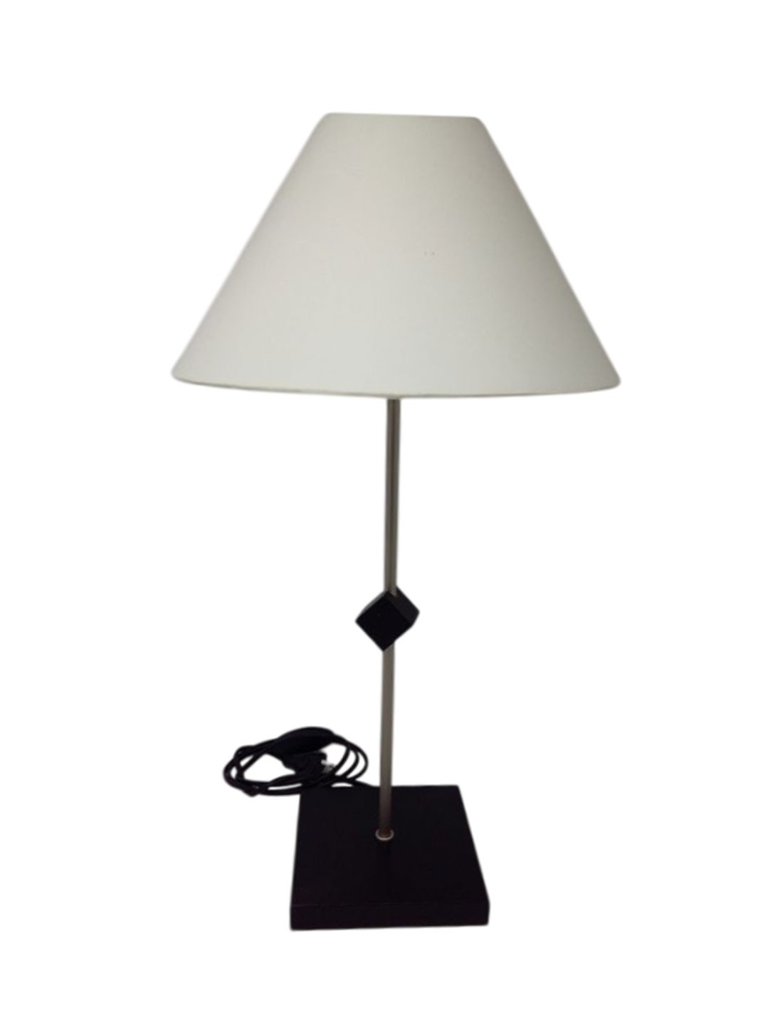 Lámpara de Sobremesa de metal con detalle wengué 1 luz y pantalla de tela. Cuadrado central y base realizados en madera.