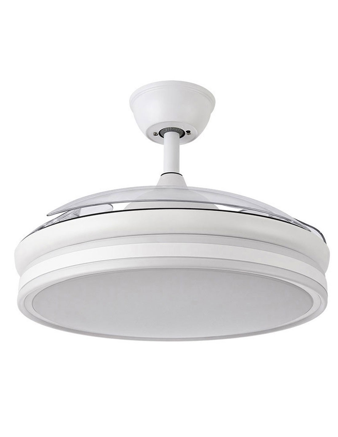 Ventilador de Techo Led de metal acabado blanco con 4 aspas de metacrilato transparentes alta resistencia. Difusor de policarbonato. 108 cm de diámetro. Mando a distancia incluido. MOTOR DC. Control de aire verano invierno. Temporizador 1/4 horas. Incluye doble tubo para 2 alturas.