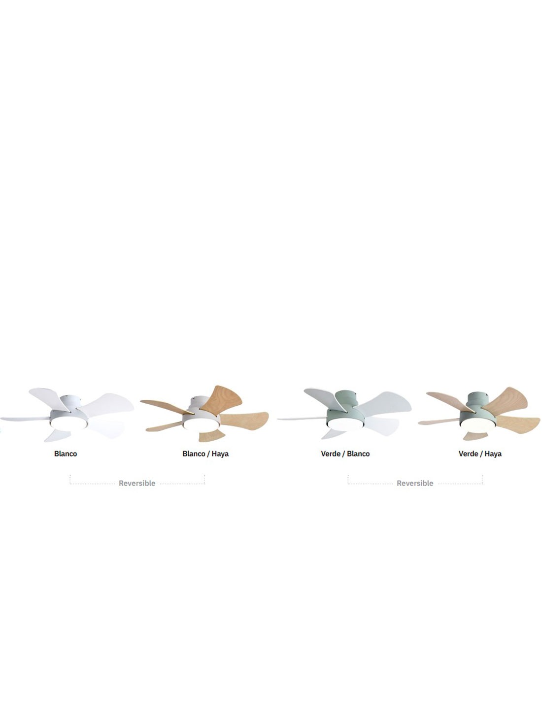 Gregario, ventiladores de techo disponibles en estructura en blanco con palas reversibles blanco haya, estructura verde con palas reversibles blanco haya y estructura gris con palas reversibles blanco haya.