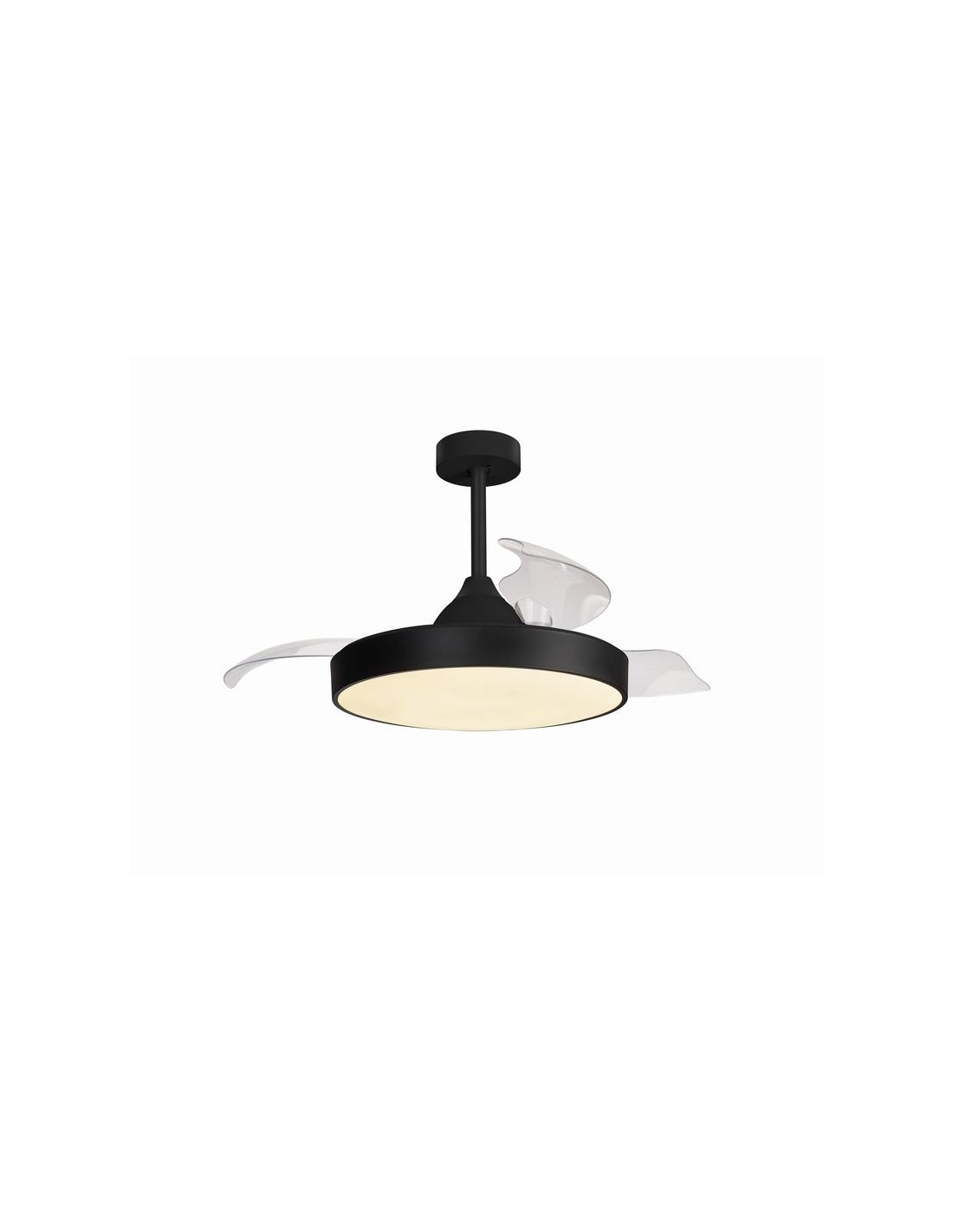 Ventilador de Techo LED cuerpo de metal acabado negro, 3 aspas ABS acabado transparente. Tulipa de Policarbonato. Mando a distancia incluido con memoria de color y APP. Función inversa invierno / verano. 8 velocidades. 3 Temperaturas de color regulables y dimable. 2 medidas de tija para adaptarlo a distintas alturas. Motor DC 30W.
